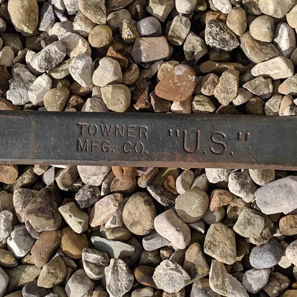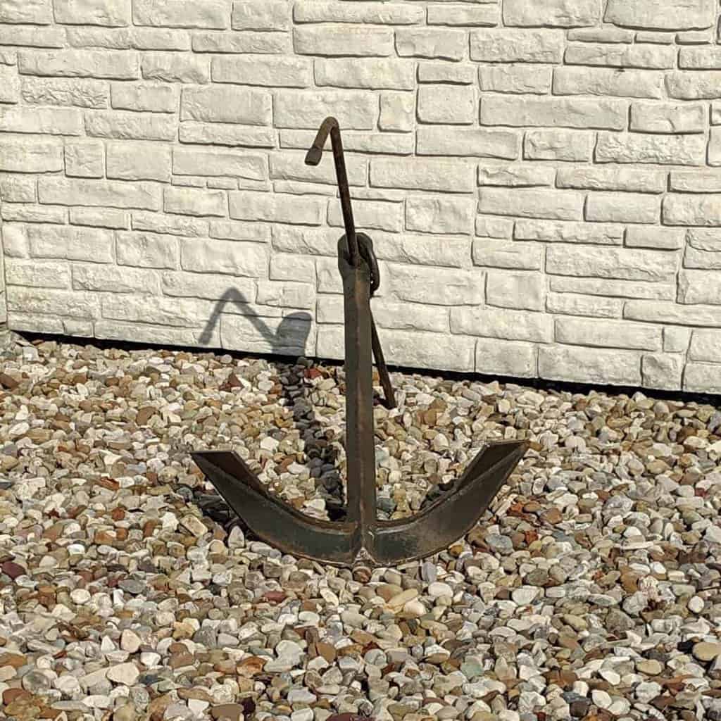 Here is a large Vintage Iron Great Lakes Anchor that was salvaged from a bailey bridge in Canada. This anchor was produced by Towner Manufacturing Company. Towner Manufacturing Company was an American company that operated from 1915 to 1986. They specialized in farming equipment and implements but their owner, Fred Towner, was a highly skilled blacksmith and eventually worked on other blacksmith projects – such as this anchor.