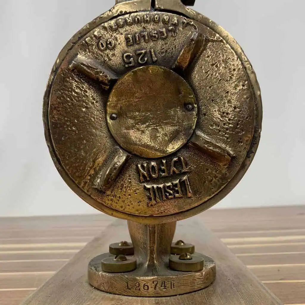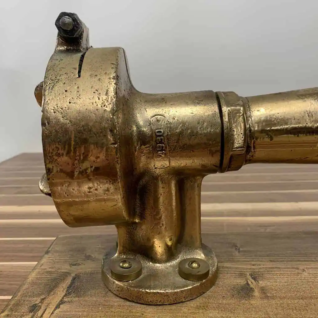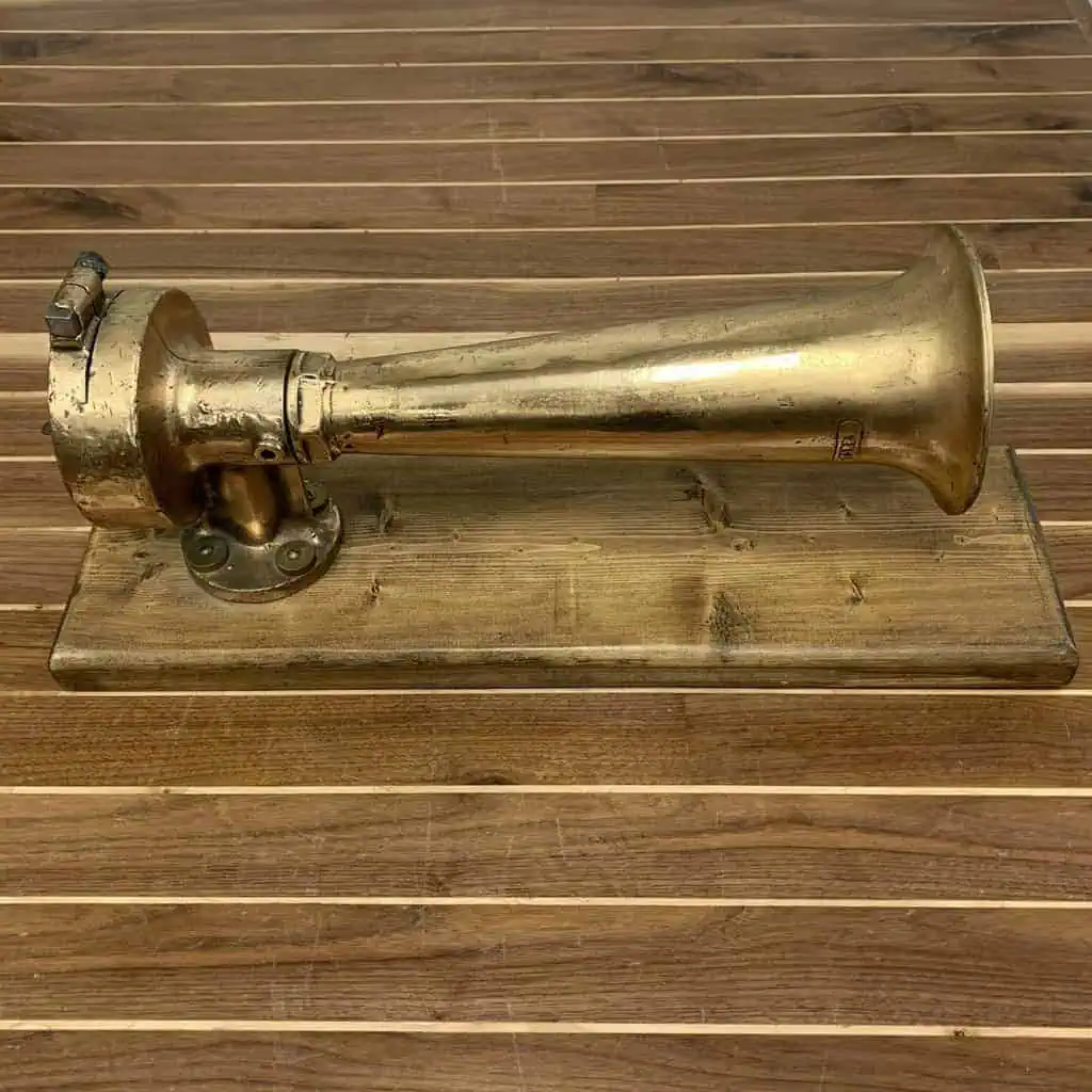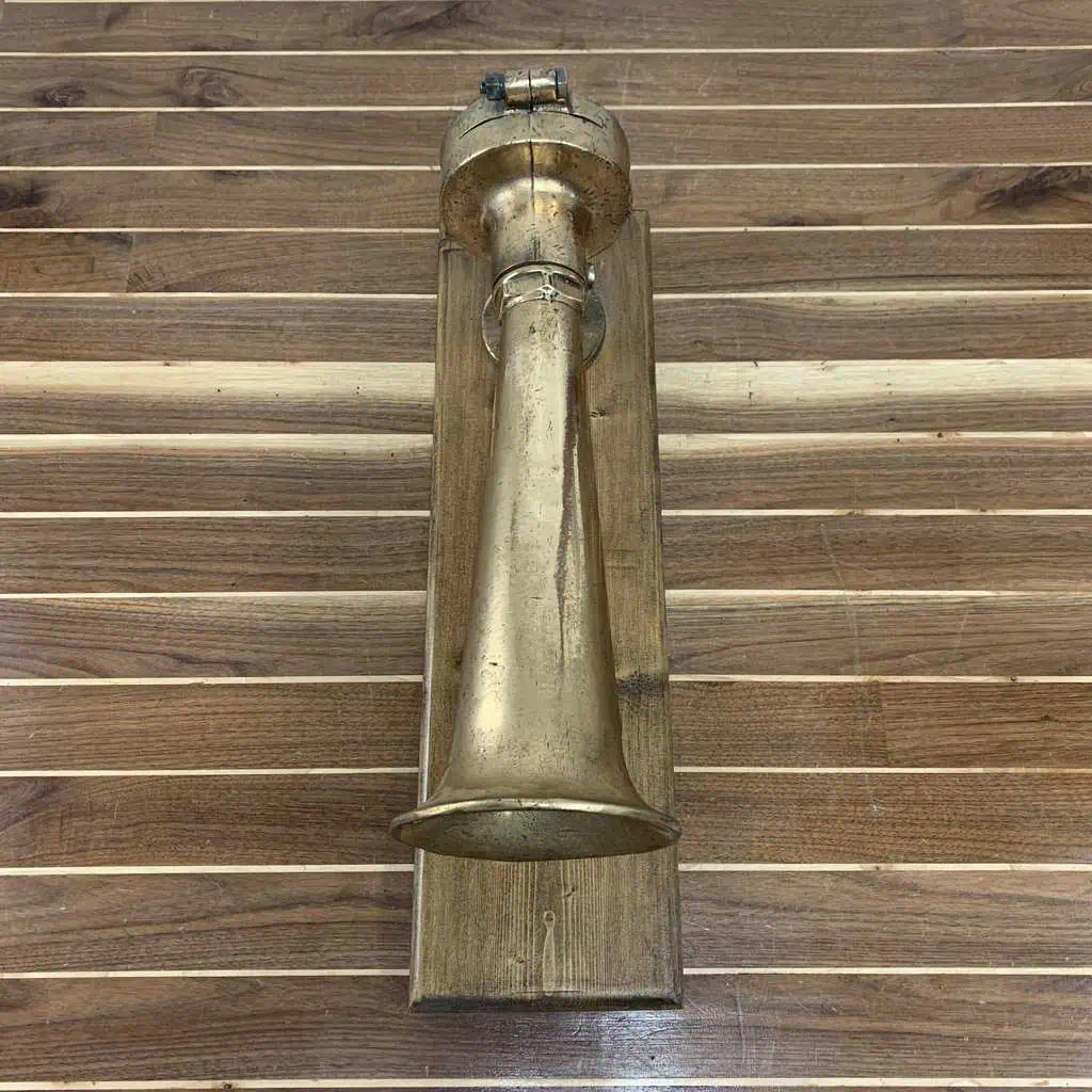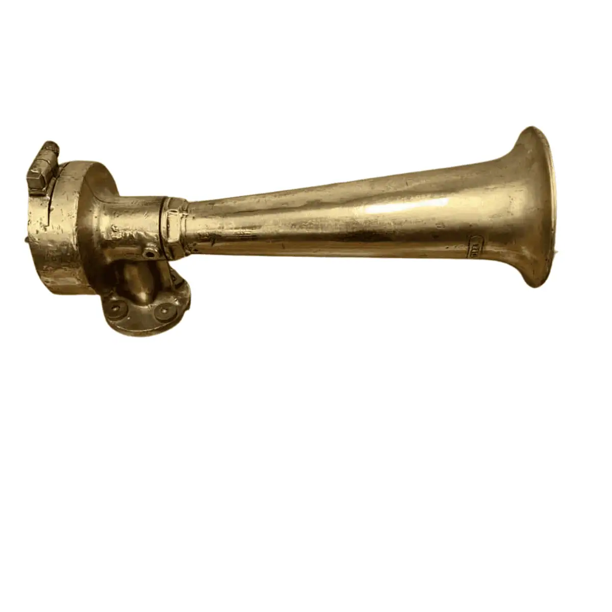 This Vintage Brass Leslie Tyfon 125 Horn is from the Leslie Tyfon Company, which primarily made its mark in the locomotive industry. However, our research unveiled an intriguing history: Leslie Tyfon Company supplied steam control equipment to military and merchant ships during both World War I and World War II.