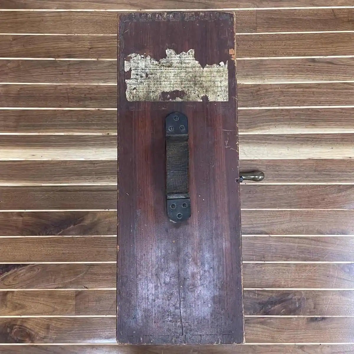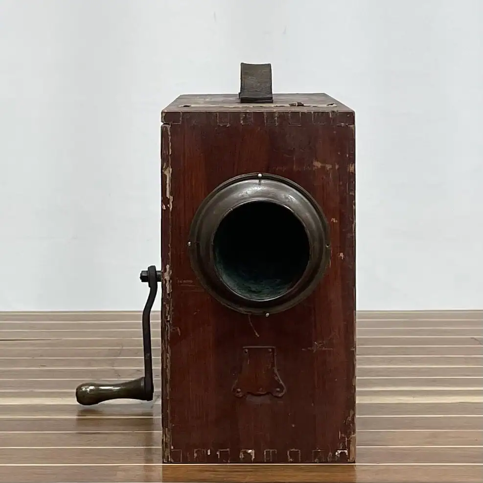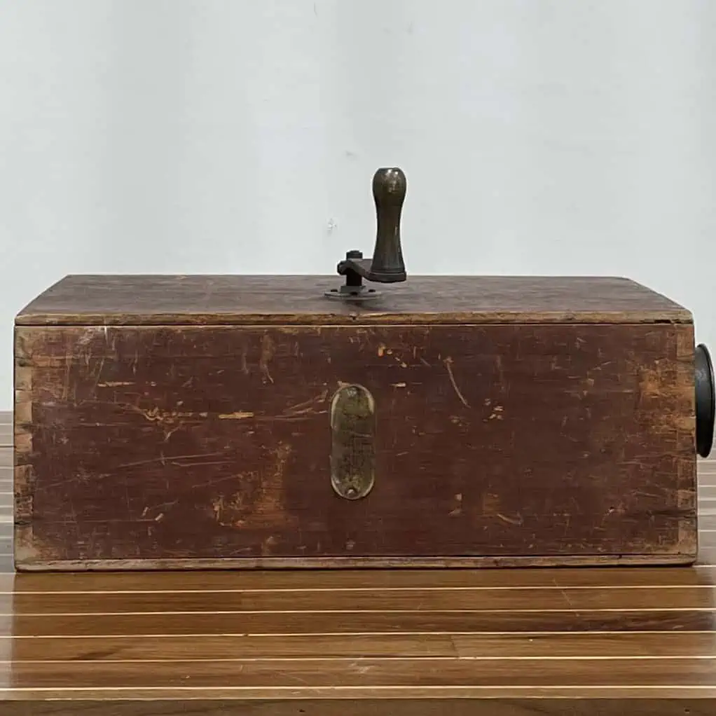 The horn sits inside a stained pine wood case. Over time, the case developed cracks, scratches, and visible wear. Although the horn no longer works, it still includes the original hand crank, a leather strap handle, and part of the instruction label. This item is being sold as is.