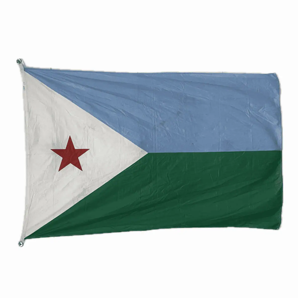 The national flag of Djibouti features two horizontal bands, light blue above light green, with a white triangle at the hoist. In the center, there is a red five-pointed star that carries deep meaning.