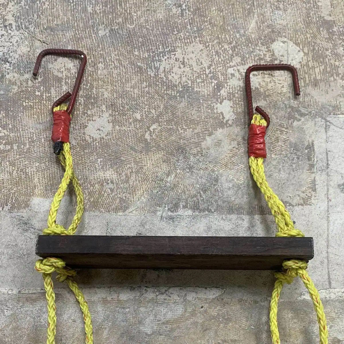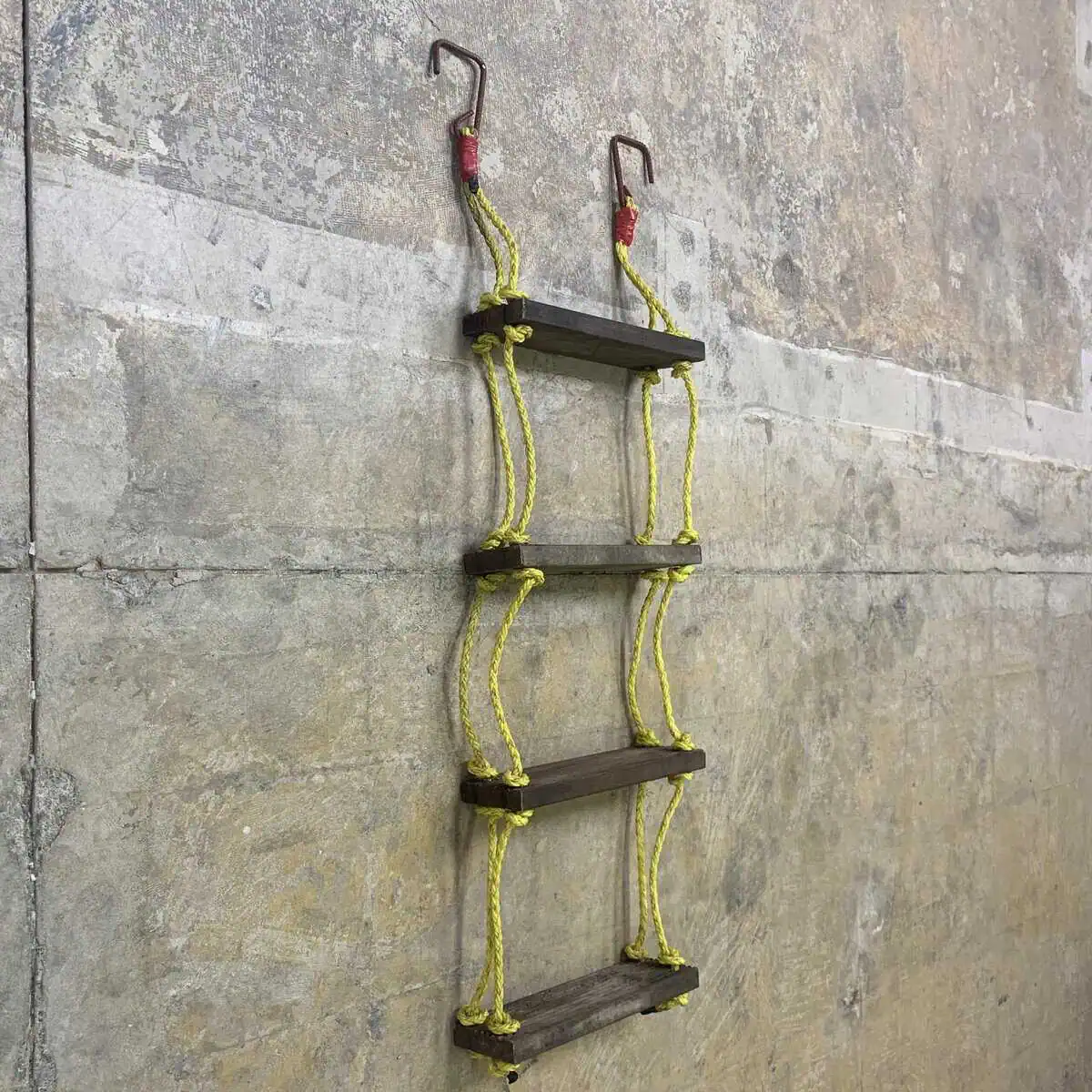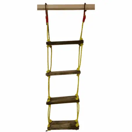 - Crafted with wooden rungs and bright yellow rope