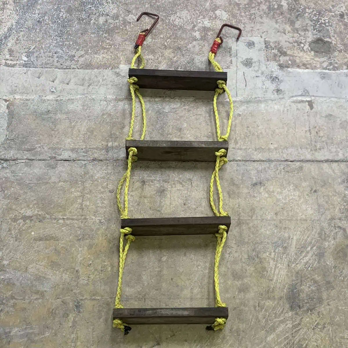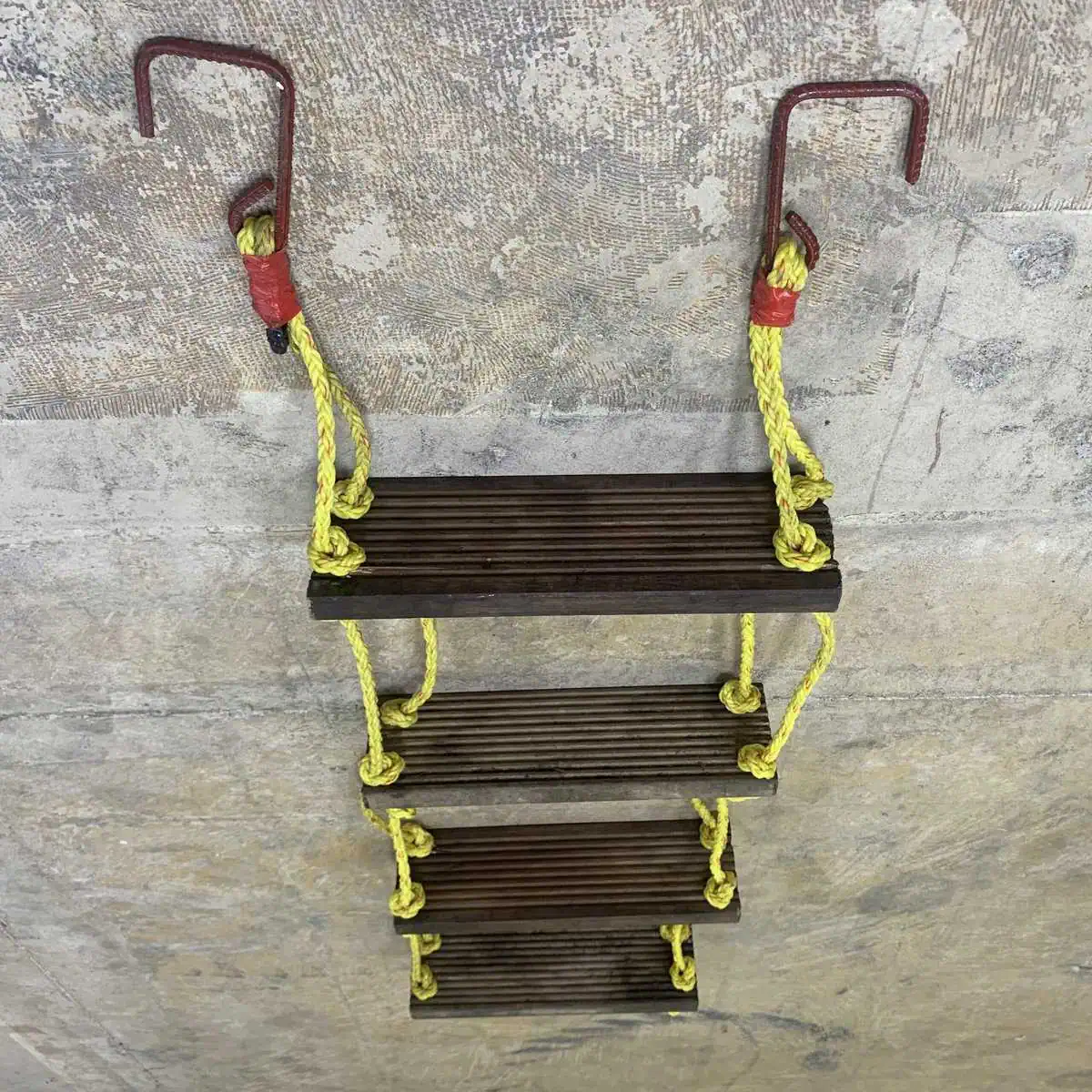 This 4-step ship ladder, featuring wooden rungs and durable yellow rope, was originally crafted for maritime settings but is now repurposed for decorative use. Its metal safety hooks and rugged appearance bring an authentic nautical feel to any environment, whether it’s a beach house, garden, or themed room. The ladder offers an eye-catching focal point for those seeking a coastal or maritime aesthetic.