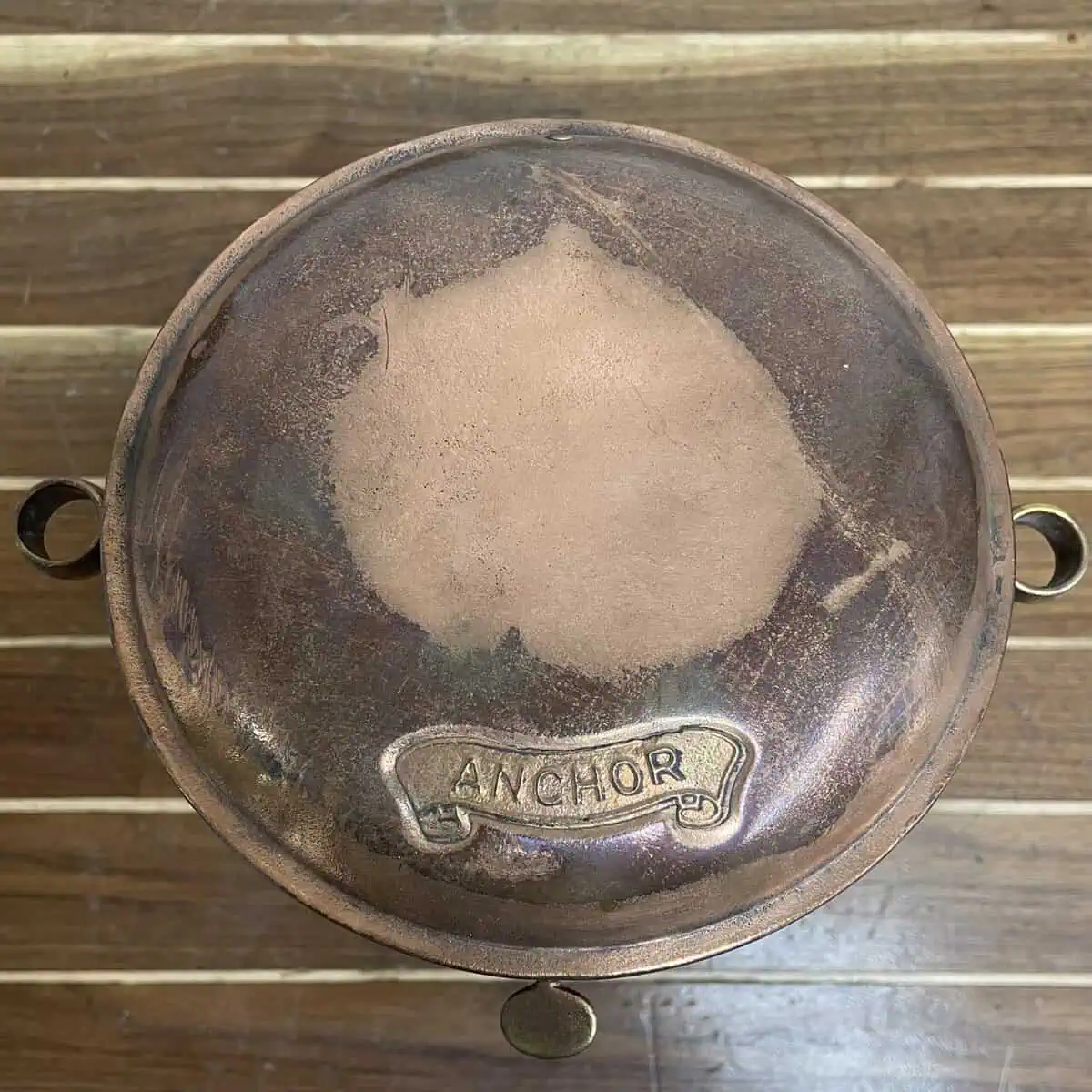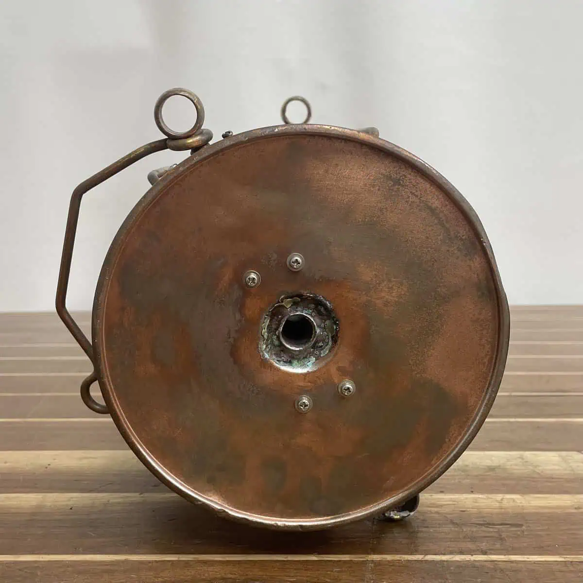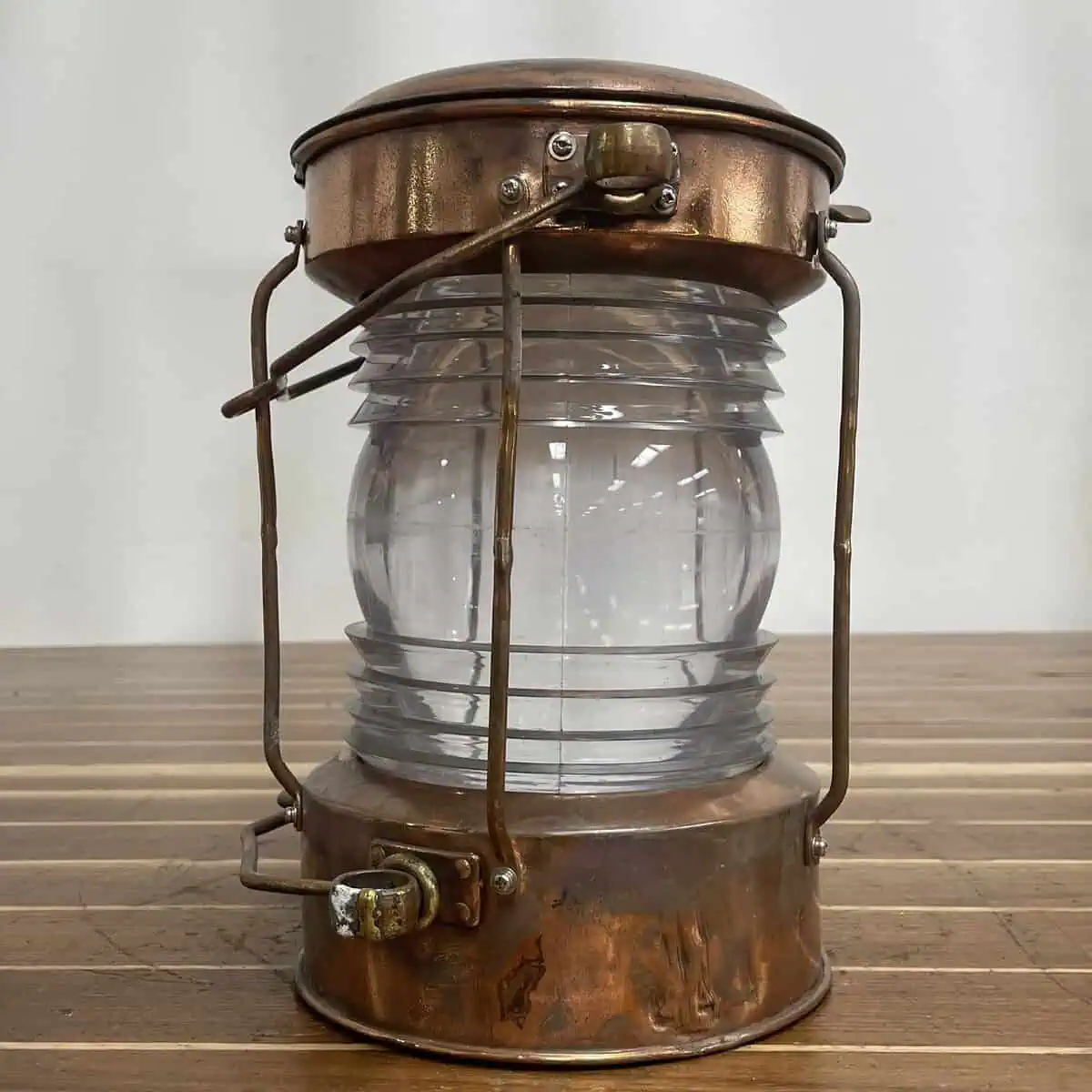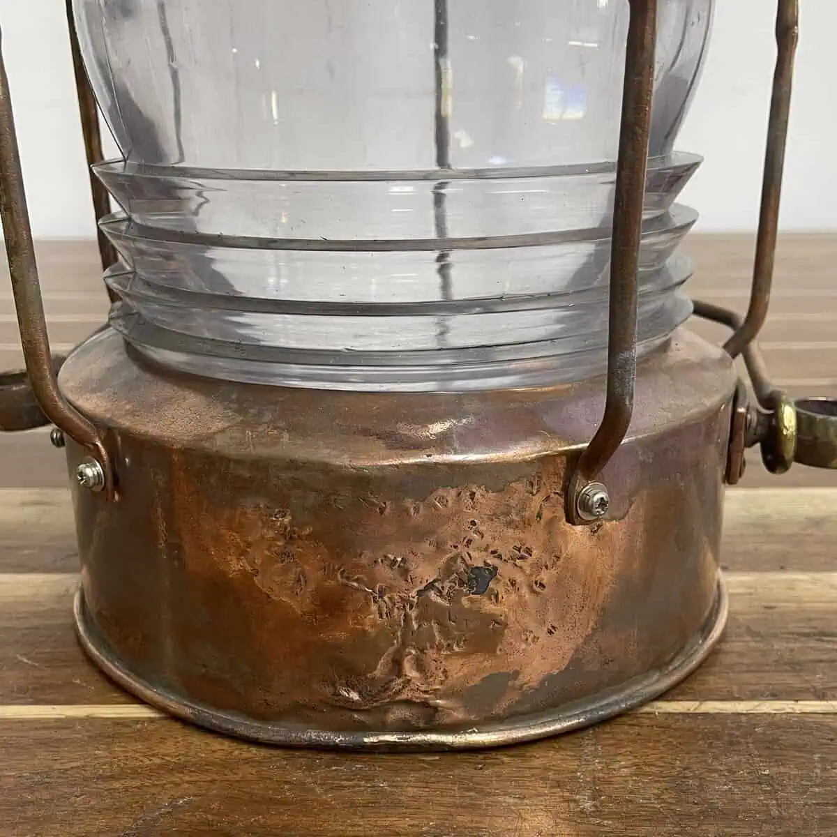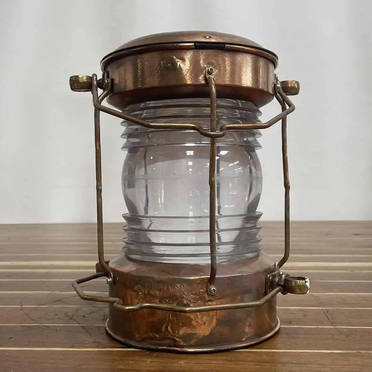 This antique copper nautical lantern comes from a salvaged marine vessel and shows heavy patina across its solid copper body. Ships used this style of lantern as an anchor light — a 360-degree white signal that marks a vessel at anchor during low visibility or night hours.