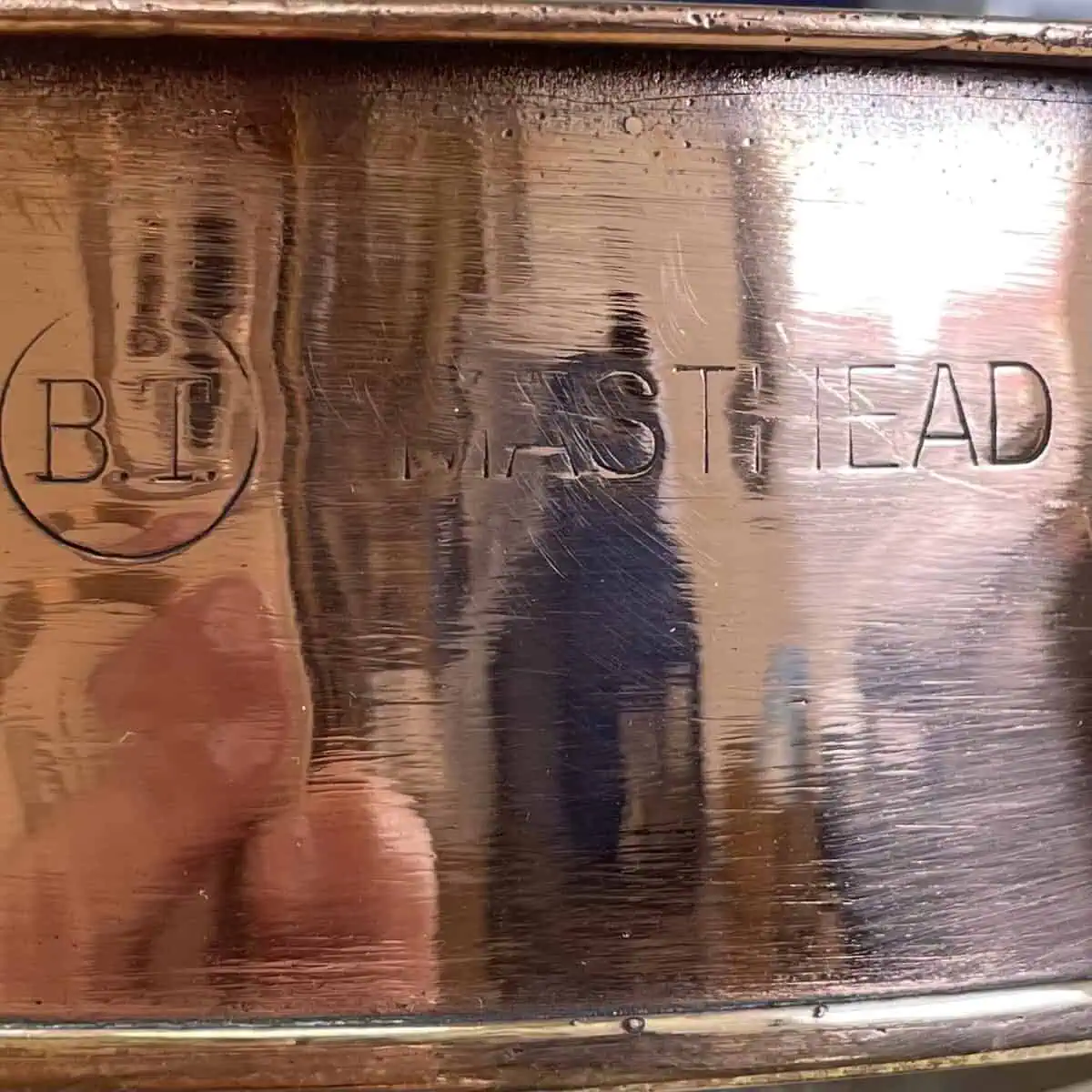 It features solid copper construction and a thick Fresnel glass lens. The glass remains in good condition without major chips or cracks. The copper shows patina and a few small dents, which add to its aged, authentic look. You’ll find “B.T.” and “Masthead” engraved into the top rim.