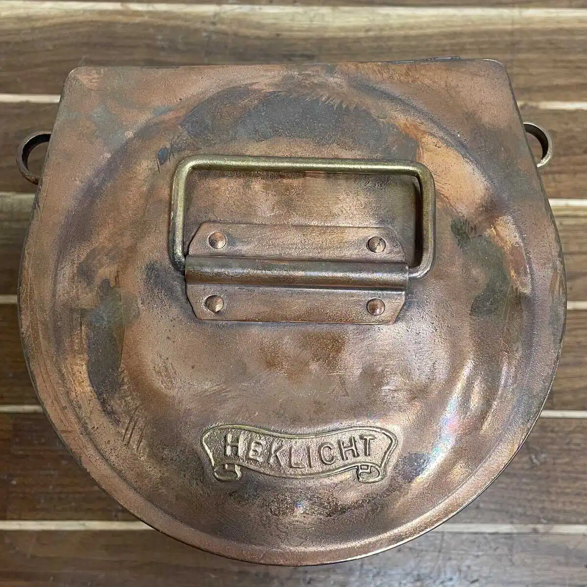 This nautical running light once served at the stern of a working vessel, guiding ships approaching from behind. Made of solid copper, the body shows an untouched patina that highlights its age and history. The word “HEKLIGHT” is stamped on the housing, confirming its use in maritime navigation.