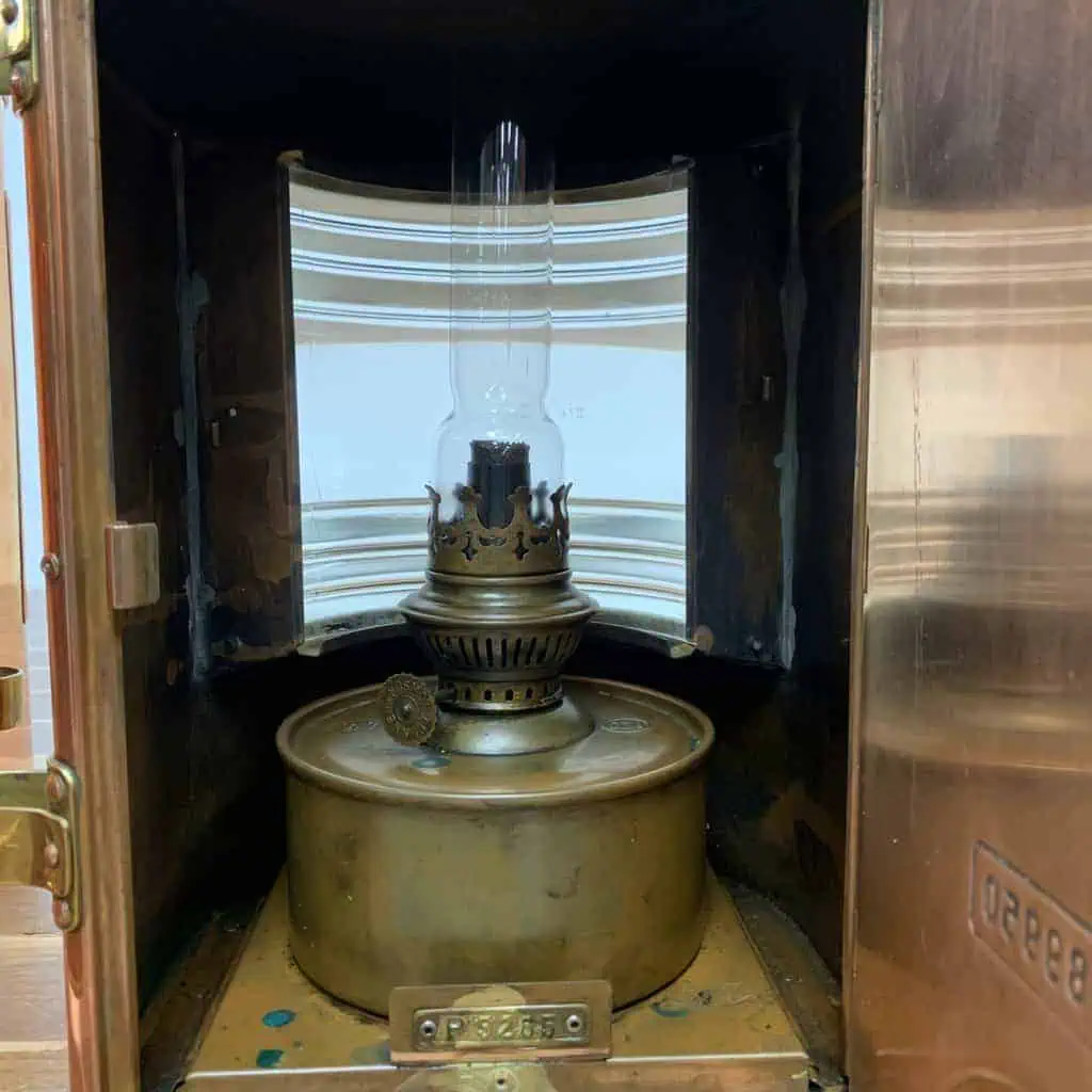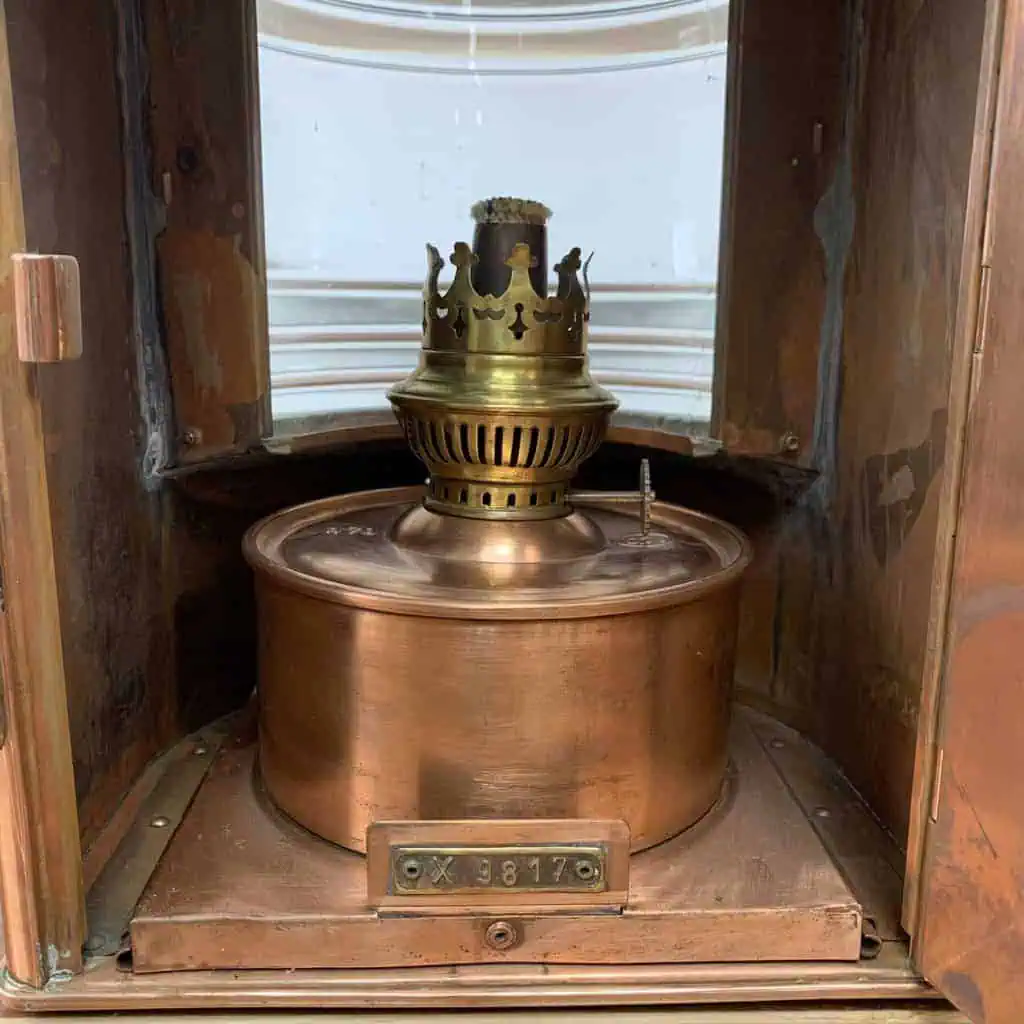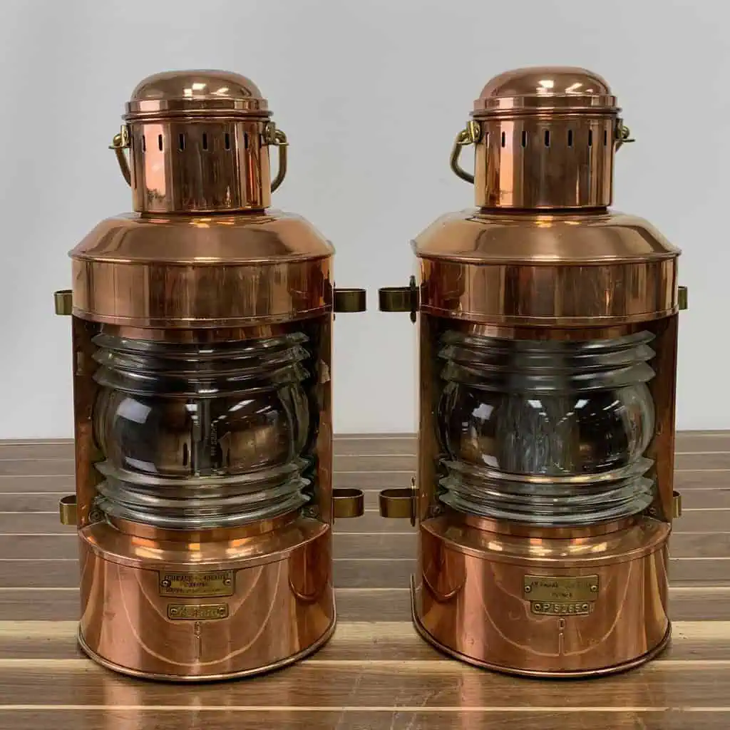 Made primarily from copper with brass accents, these lanterns both have Fresnel lenses that are in great condition. Marked with plaques reading AHLEMANN & SCHLATTER, BREMEN, and distinct identification numbers – X8968 and P5265 respectively – each lantern has some scratches and markings. One lantern retained its glass bulb, while the other has the oil chamber but no globe as shown in photos.