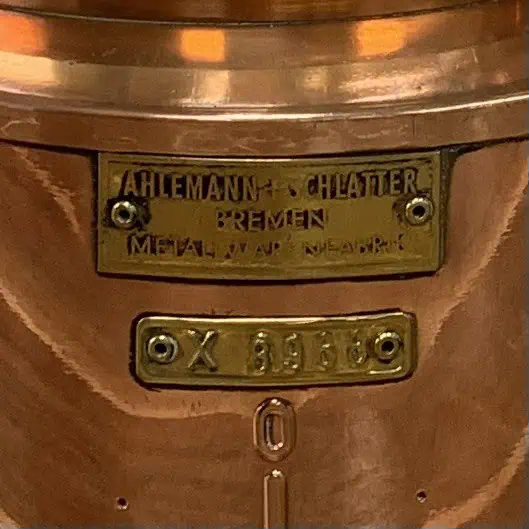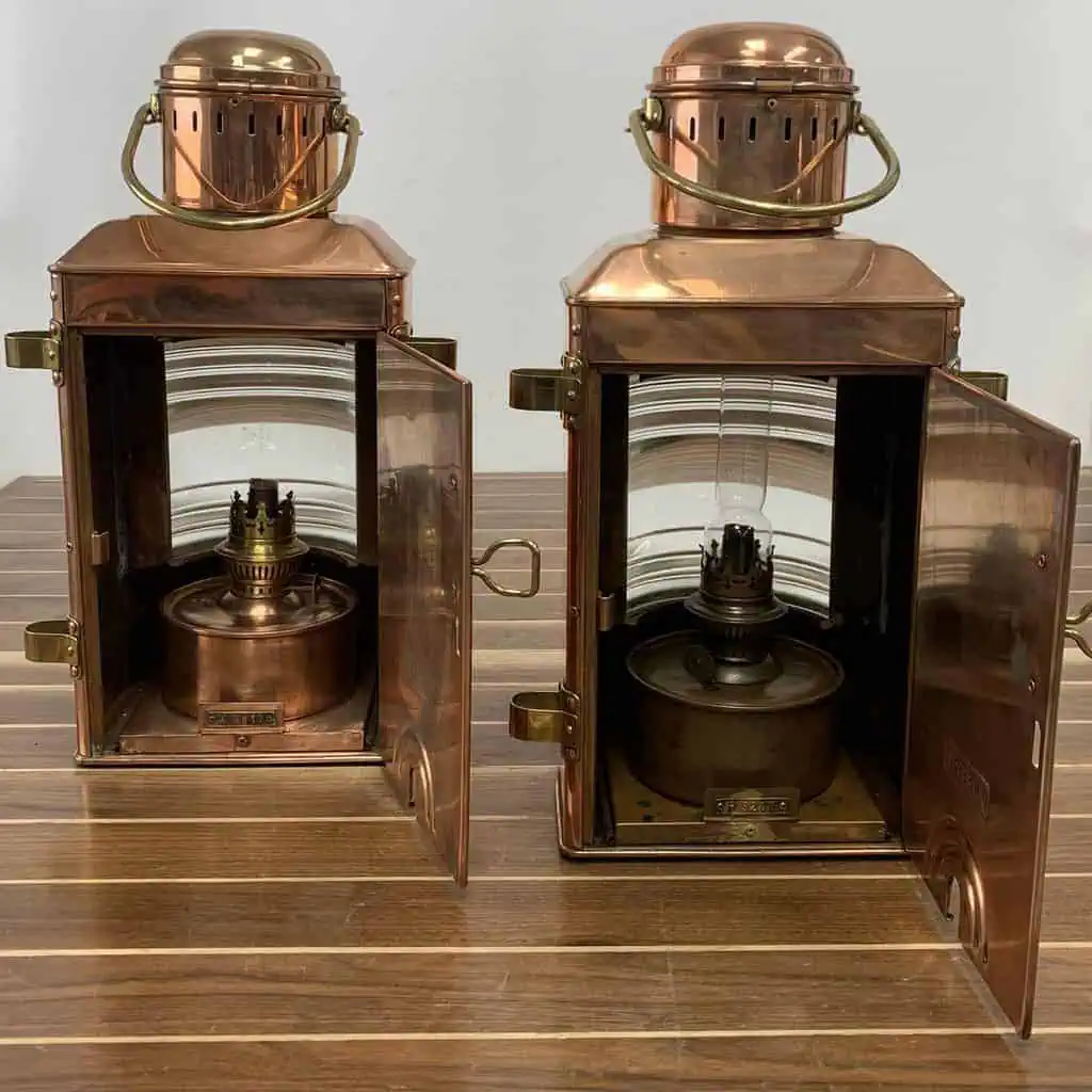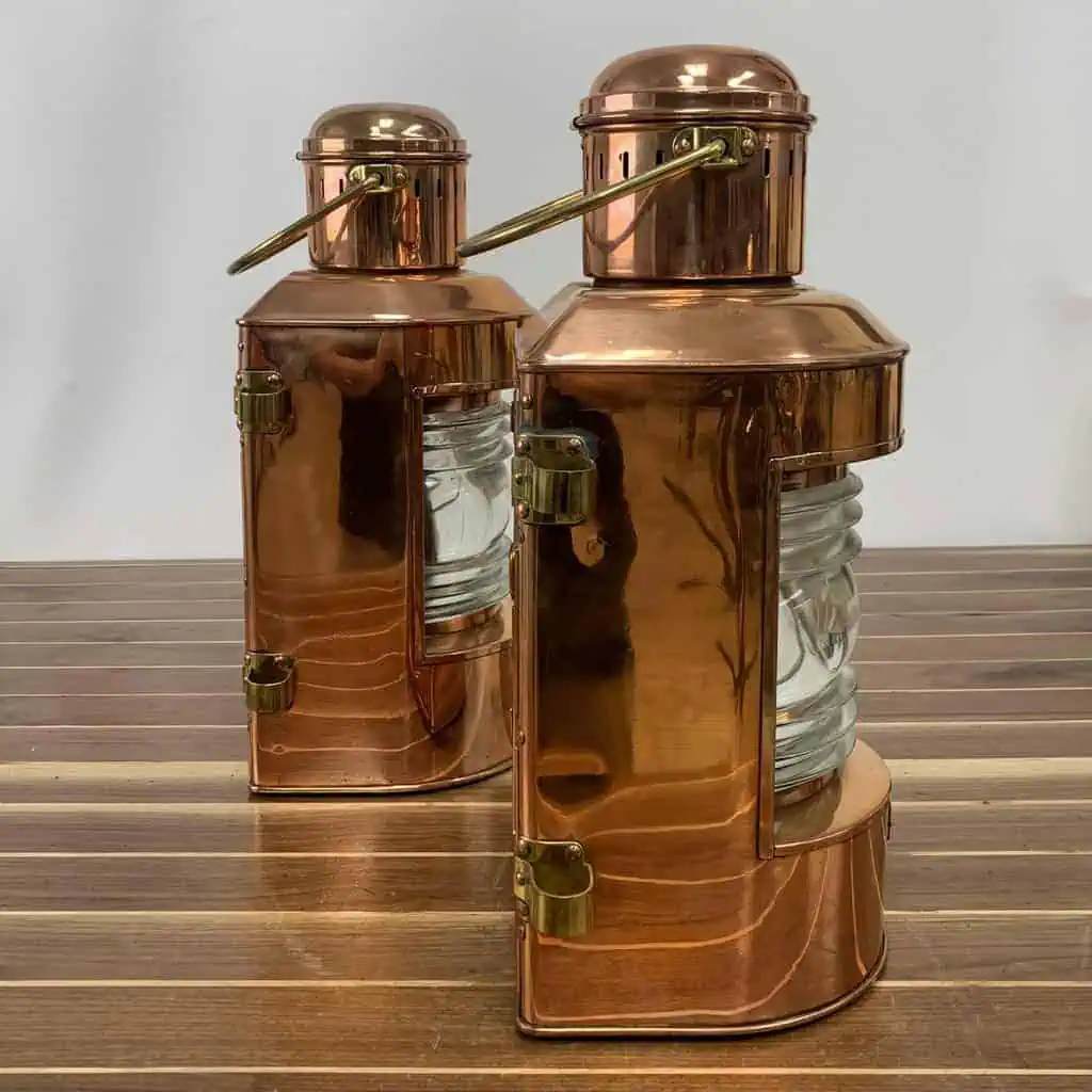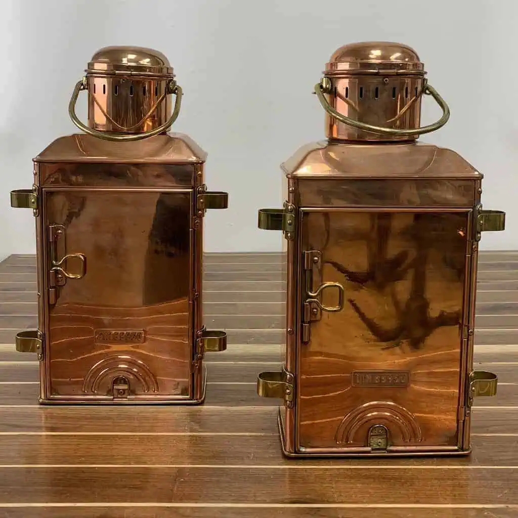This Vintage AHELMANN & Schlatter Copper Oil Lanterns-Set comes from Bremen, Germany, a city with a maritime legacy since 1868.