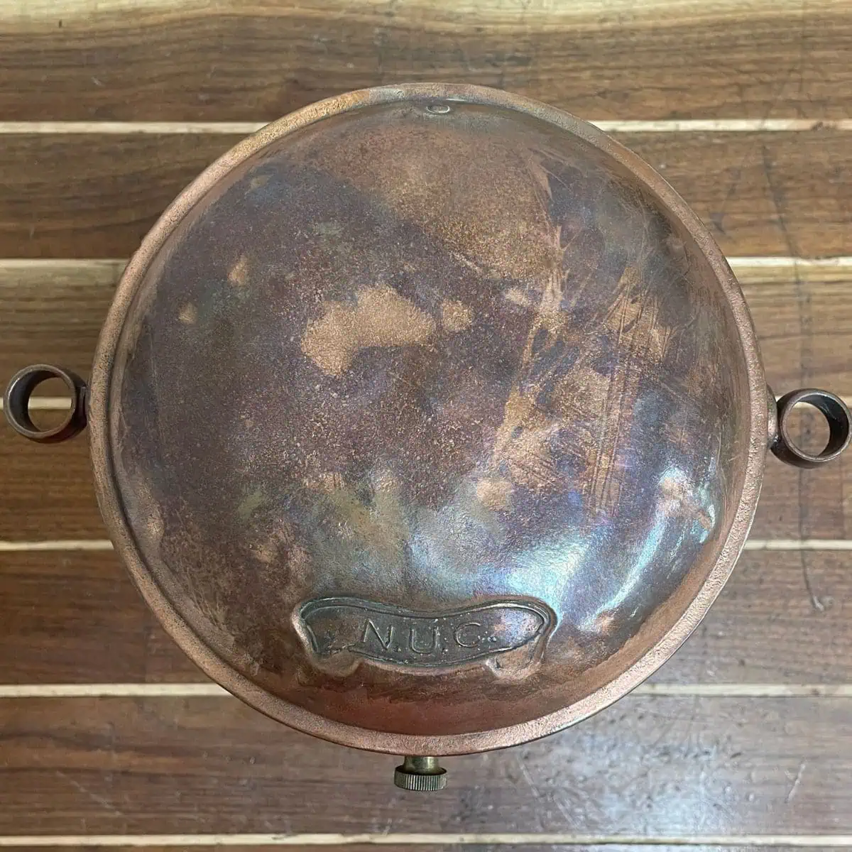 On top of the lid, you’ll find a stamped “N.U.C.” marking. This detail helps confirm its original marine use and adds to the overall character of the piece.