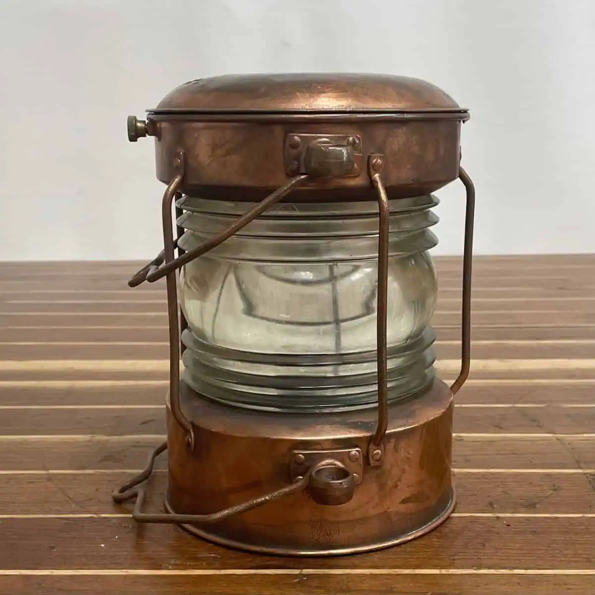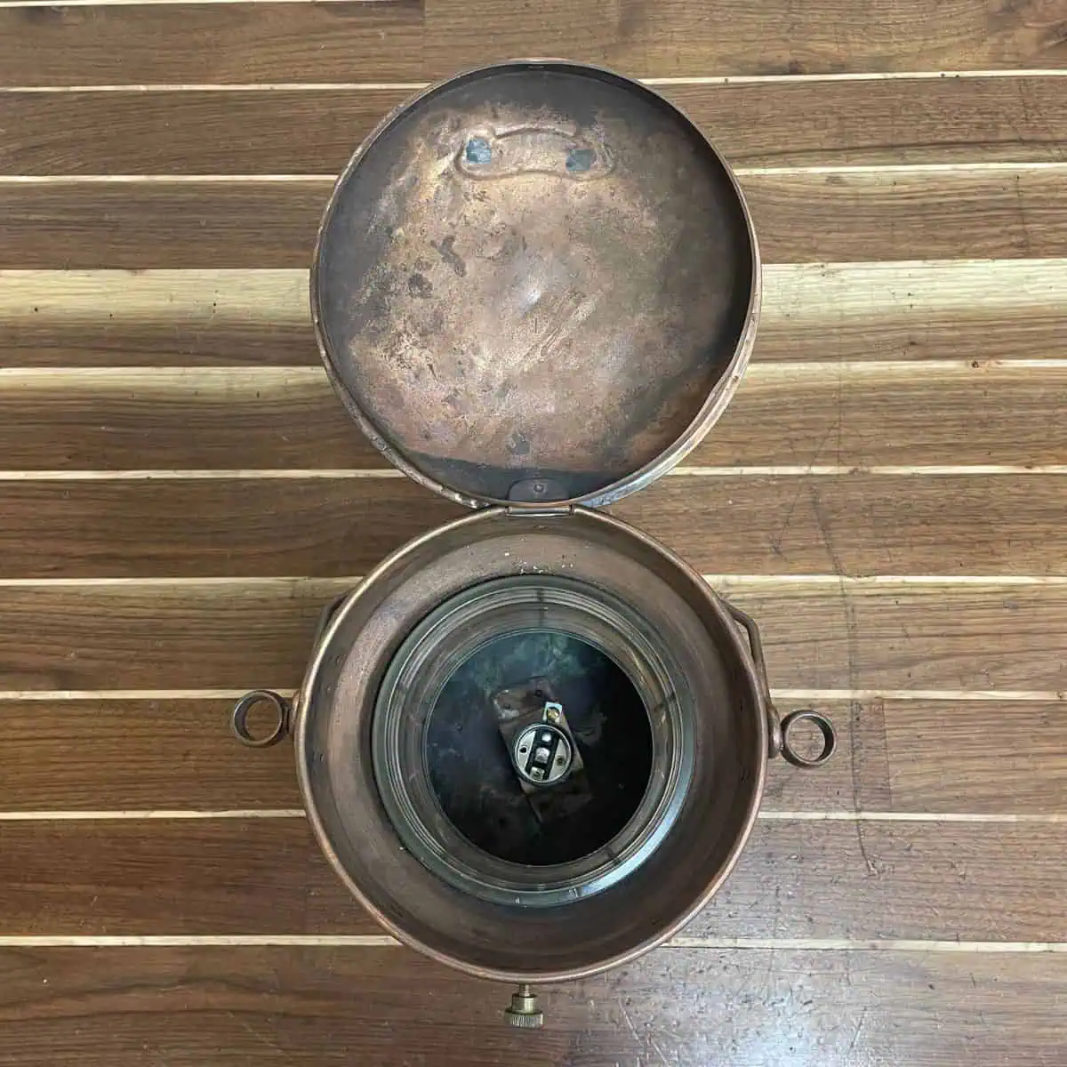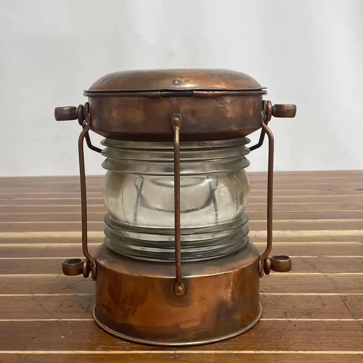 This vintage copper ship lantern comes from a working marine environment and shows clear signs of use. The solid copper body has developed heavy patina across the entire surface. As a result, you’ll see a mix of darker tones and exposed copper, especially along the lid and base.