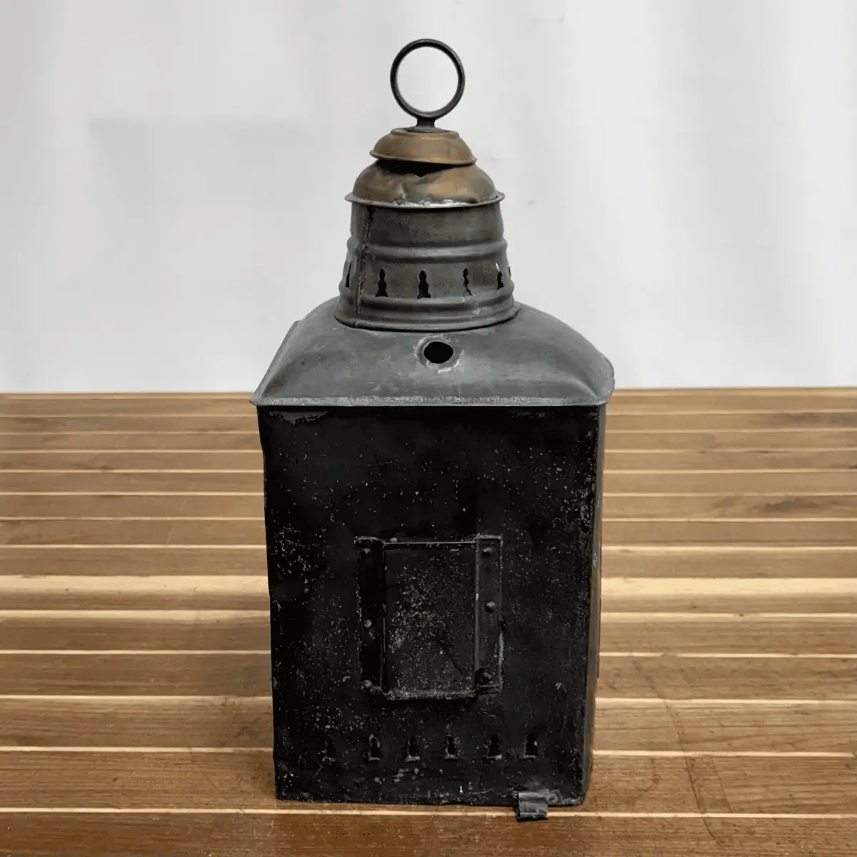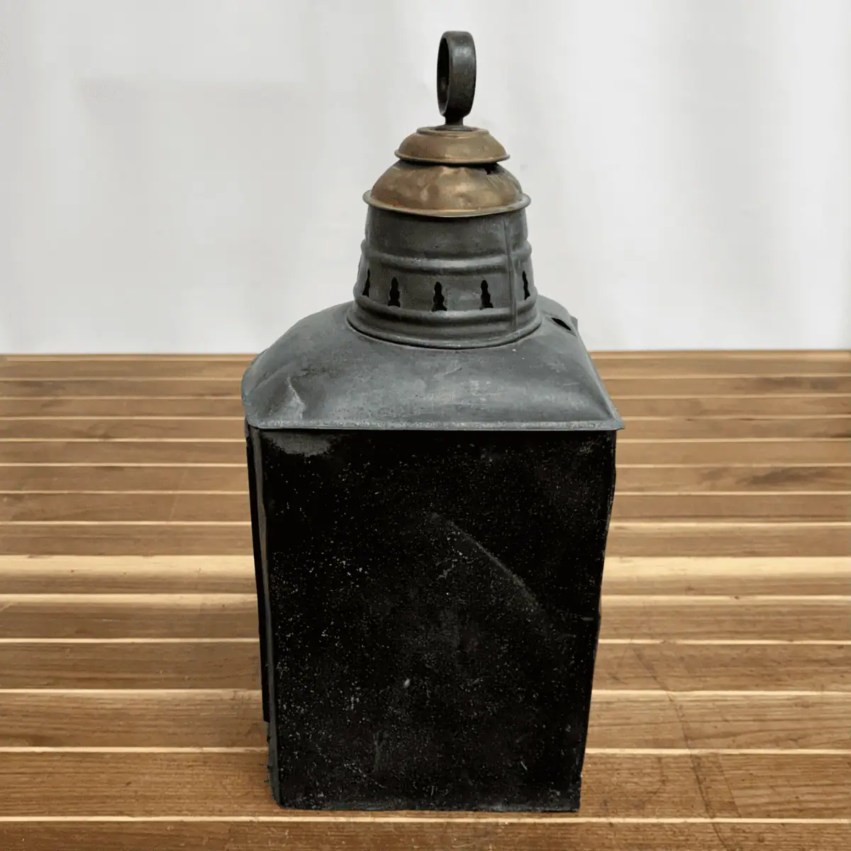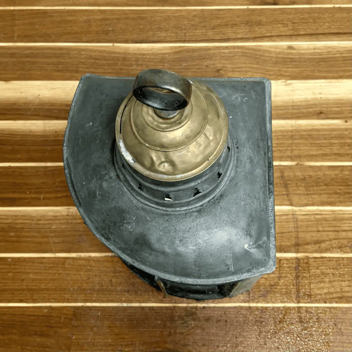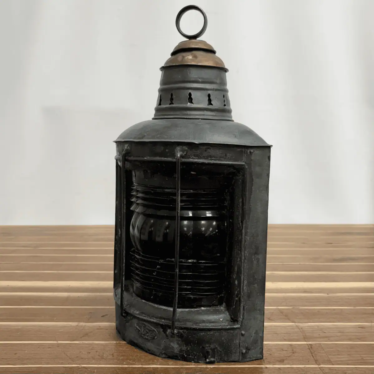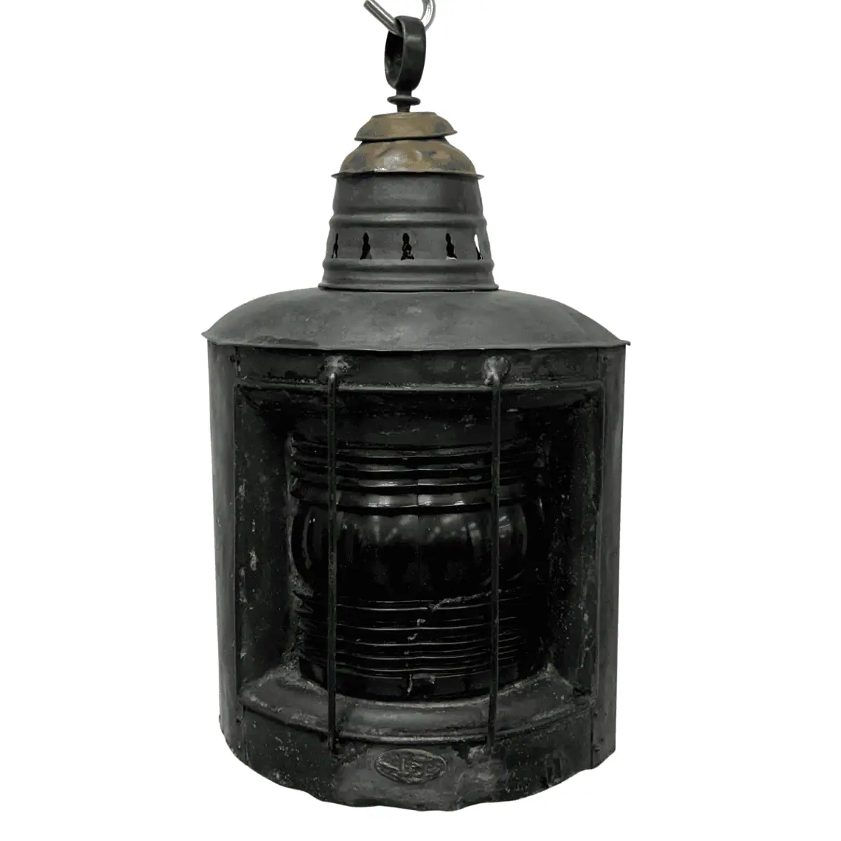 During the transition from oil to early electric ship lighting, Geo. B. Carpenter & Co. supplied durable marine lanterns for commercial vessels. As a result, examples like this represent some of the earliest electrically designed navigation lights used at sea. The lantern shows authentic marine wear, including oxidation, surface marks, and age-related patina. Additionally, the original maker’s plate remains present, although years of service have softened its detail.