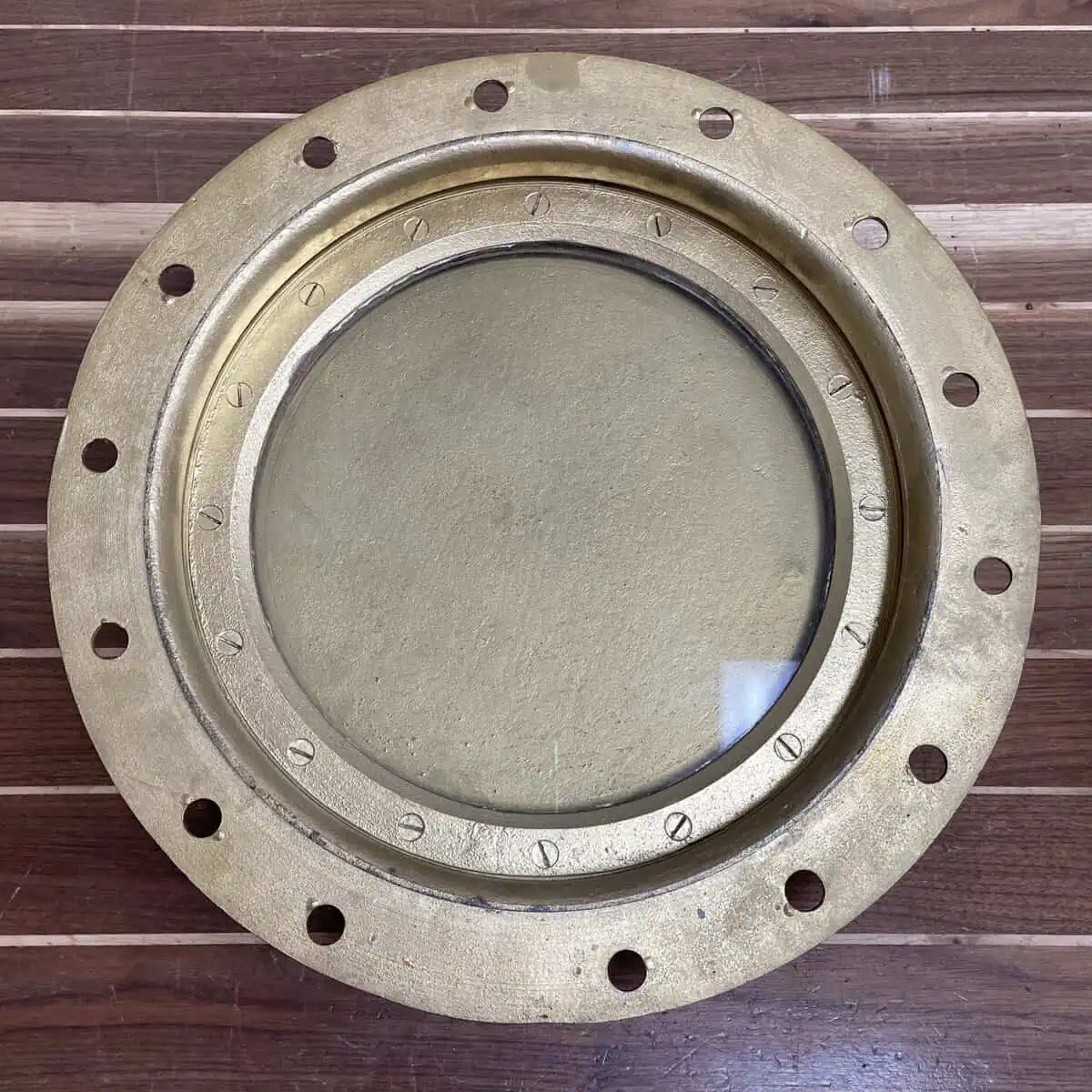 This iron ship porthole was salvaged from a working vessel and coated in a gold-colored paint. It measures 17.75 inches across and weighs 36.5 pounds, giving it a solid, noticeable feel. The glass sits firmly in place and remains in excellent condition.