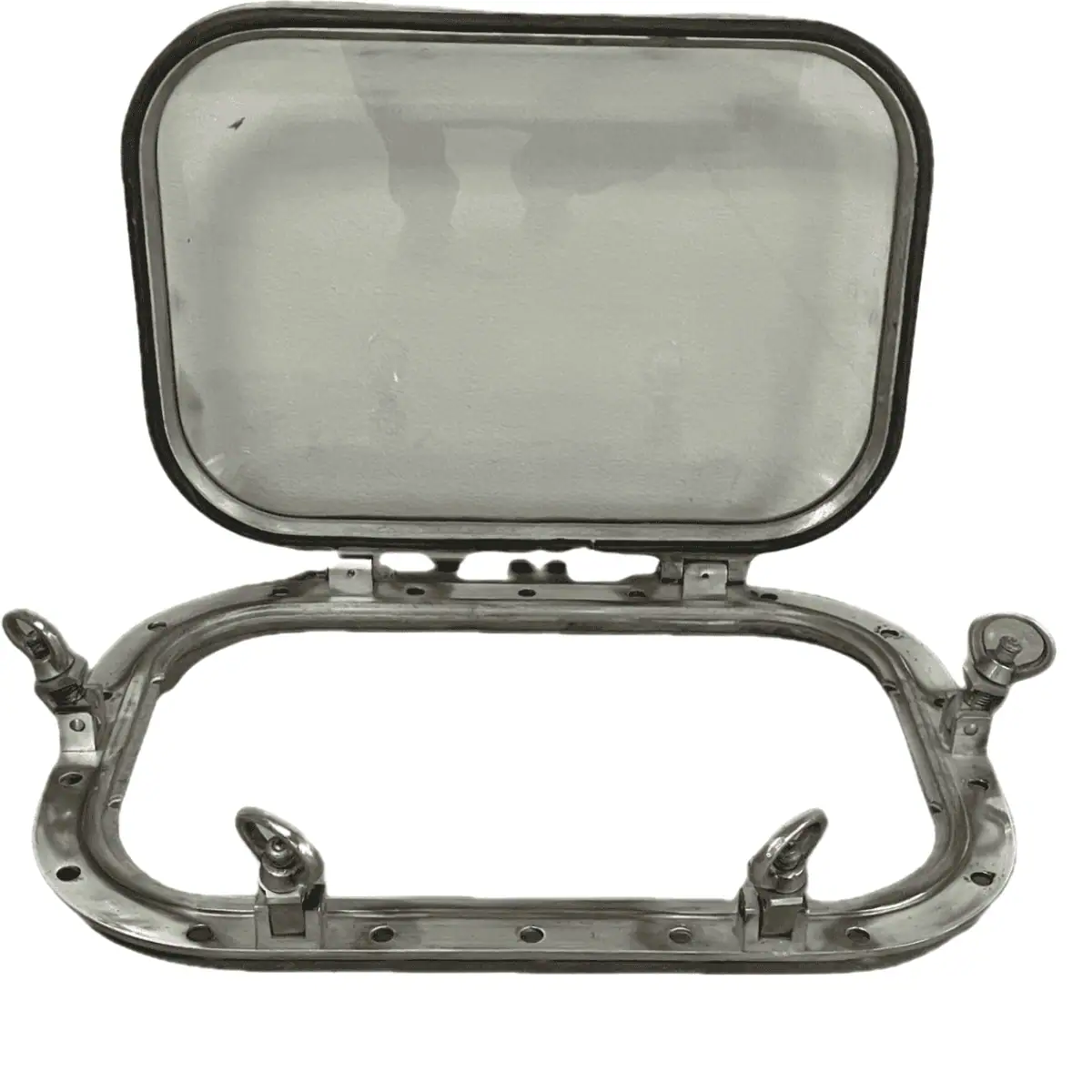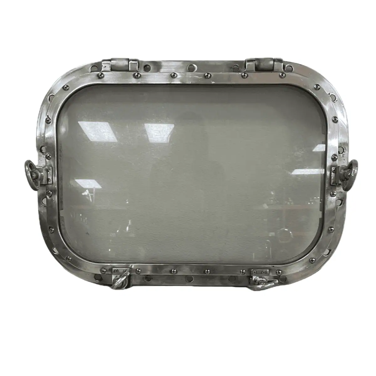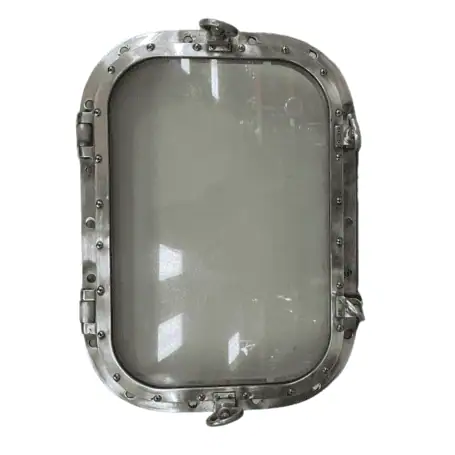 This salvaged aluminum rectangular porthole measures 28.25 inches wide by 20.5 inches tall. It has a .75-inch inset and extends 5 inches from the mounting surface. You can install it on doors or walls.