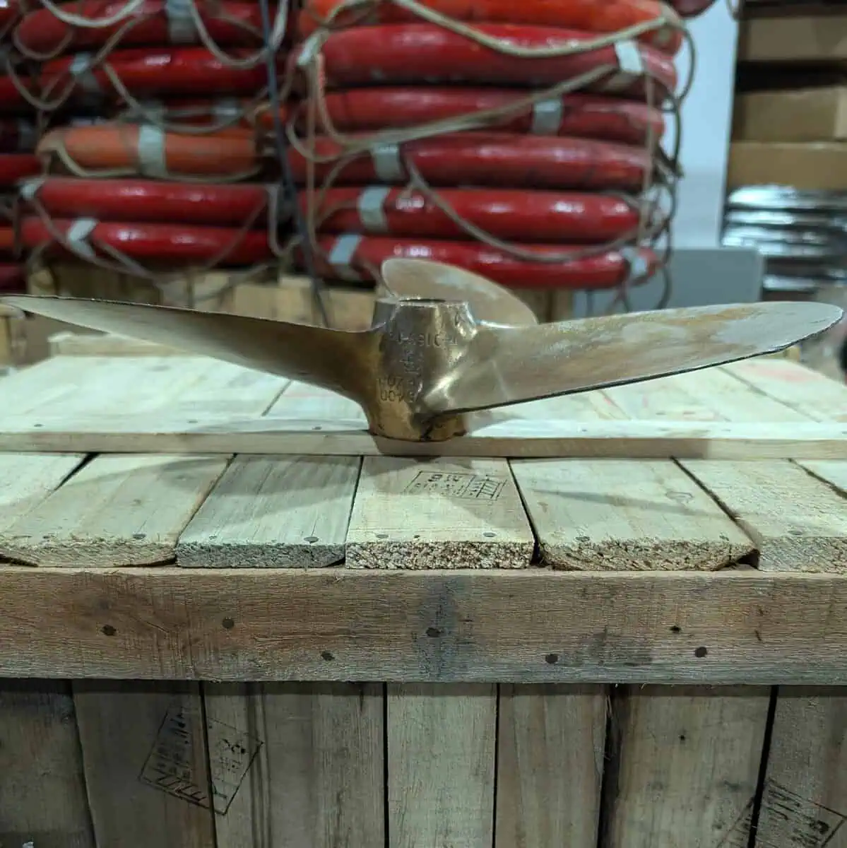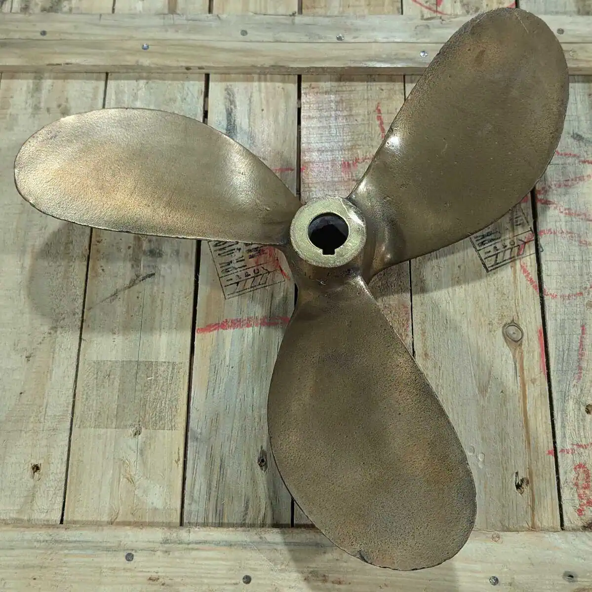 While its exact origin is unknown, this propeller shows signs of its life at sea with a few dings along the edges, giving it an authentic, salvaged character. The bronze material has developed a natural patina over time, enhancing its vintage appeal.