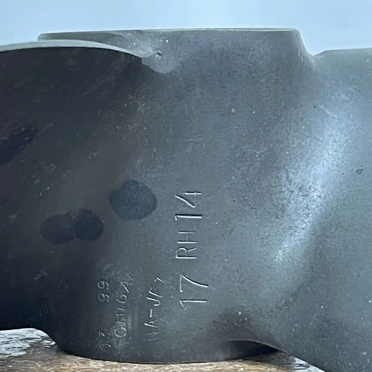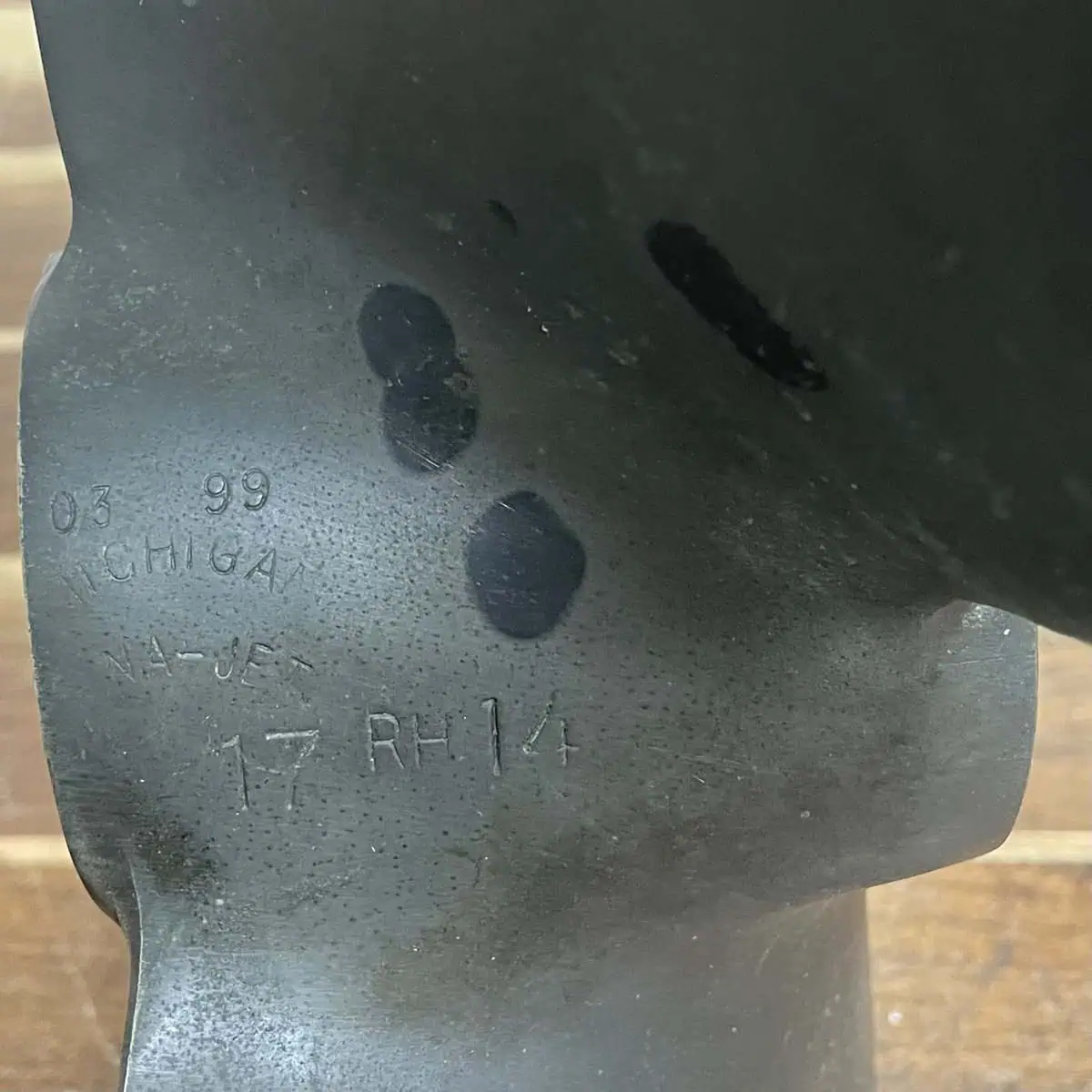 A working vessel once used this propeller, and it still carries the signs of that service. You’ll find the original markings stamped directly on the metal, including “17 RH 14.” It has three blades and a standard bore configuration.