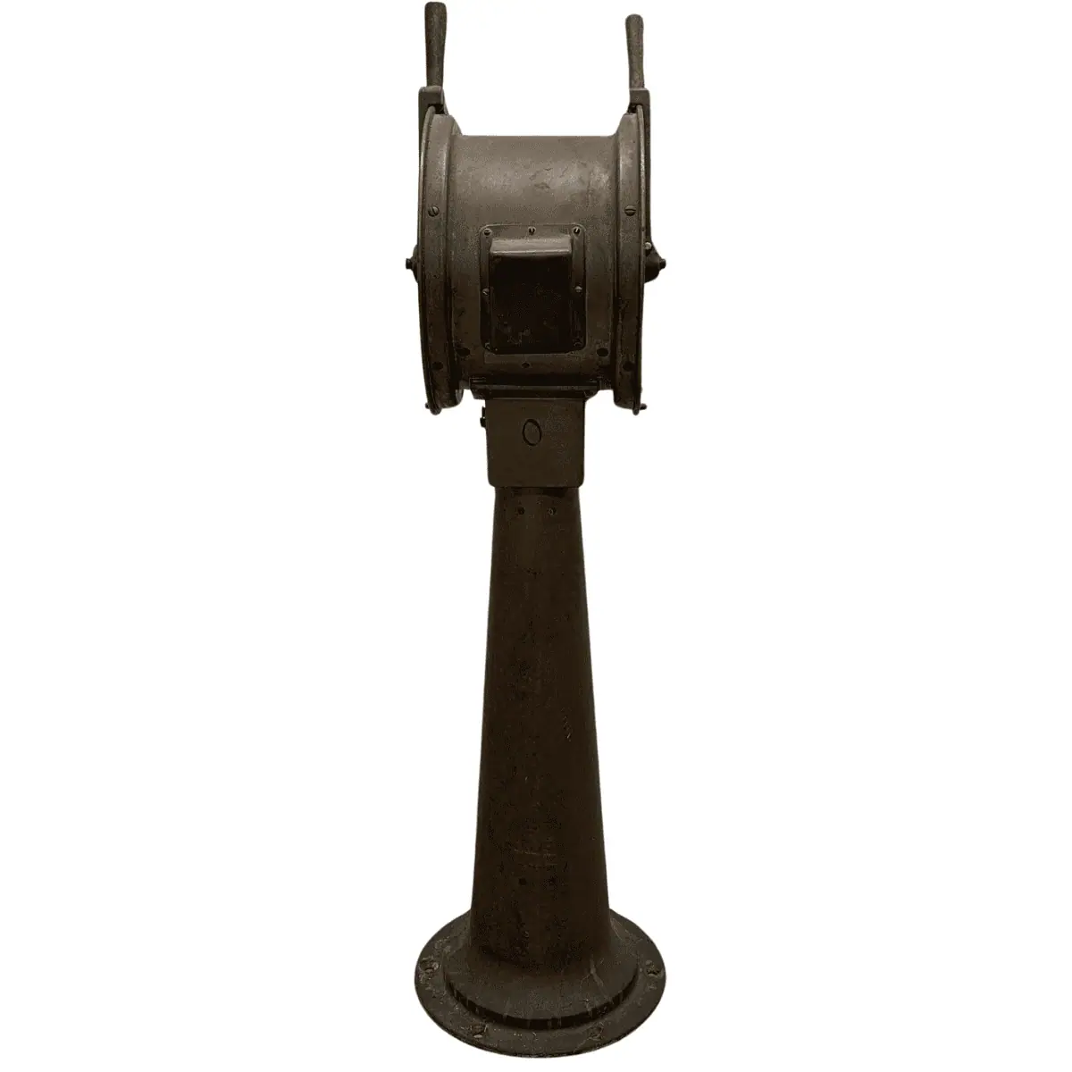 Crews used this device to send speed and direction commands from the bridge to the engine room. The handle still rings the bell, offering a working bit of that original functionality.