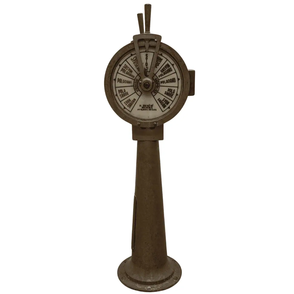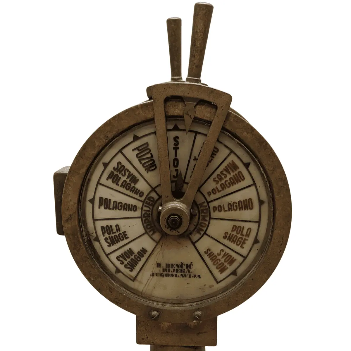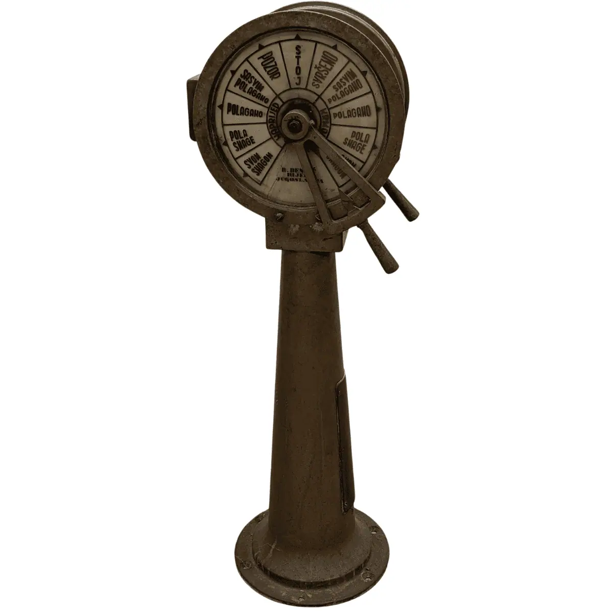This Engine Order Telegraph came out of Jugoslavia, built sometime between the 1960s and 1990s. It served on ships in the Yugoslavian Navy, along with other components like control wheels, valves, and propellers. From what we’ve found, these telegraphs rarely appear online. Most of them likely remain in Eastern Europe.