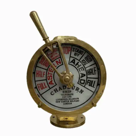 This vintage Chadburn ship telegraph features solid brass construction and was originally used to send engine commands from the bridge to the engine room. Chadburn Ship Telegraph Co. Ltd. manufactured it in the UK, with markings for Liverpool, Glasgow, New Castle, Belfast, and London.
