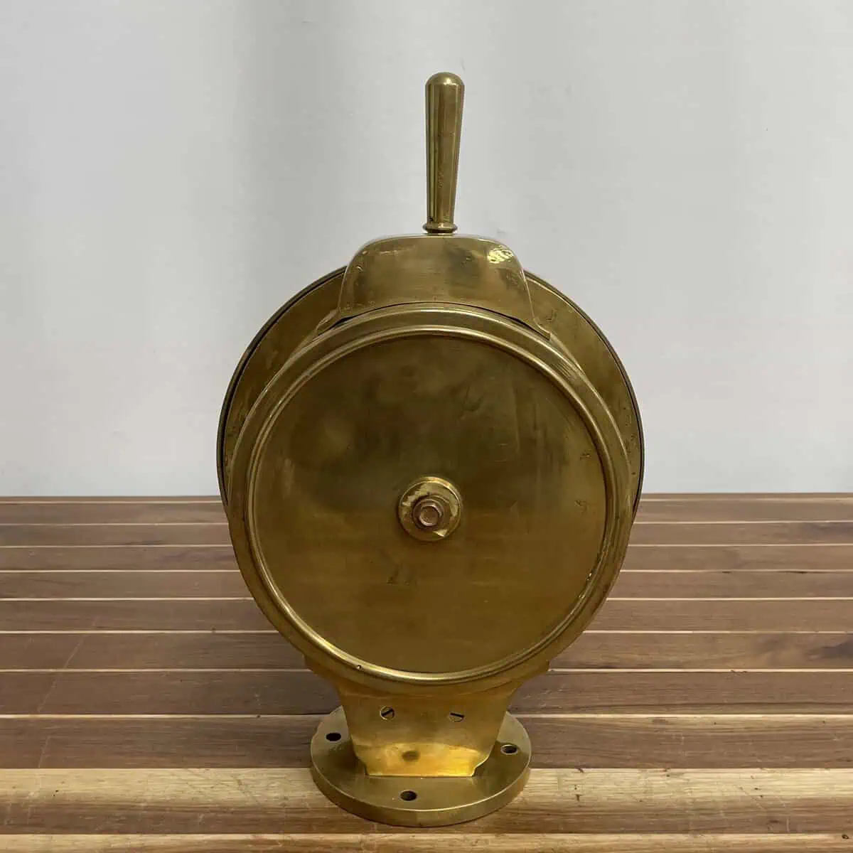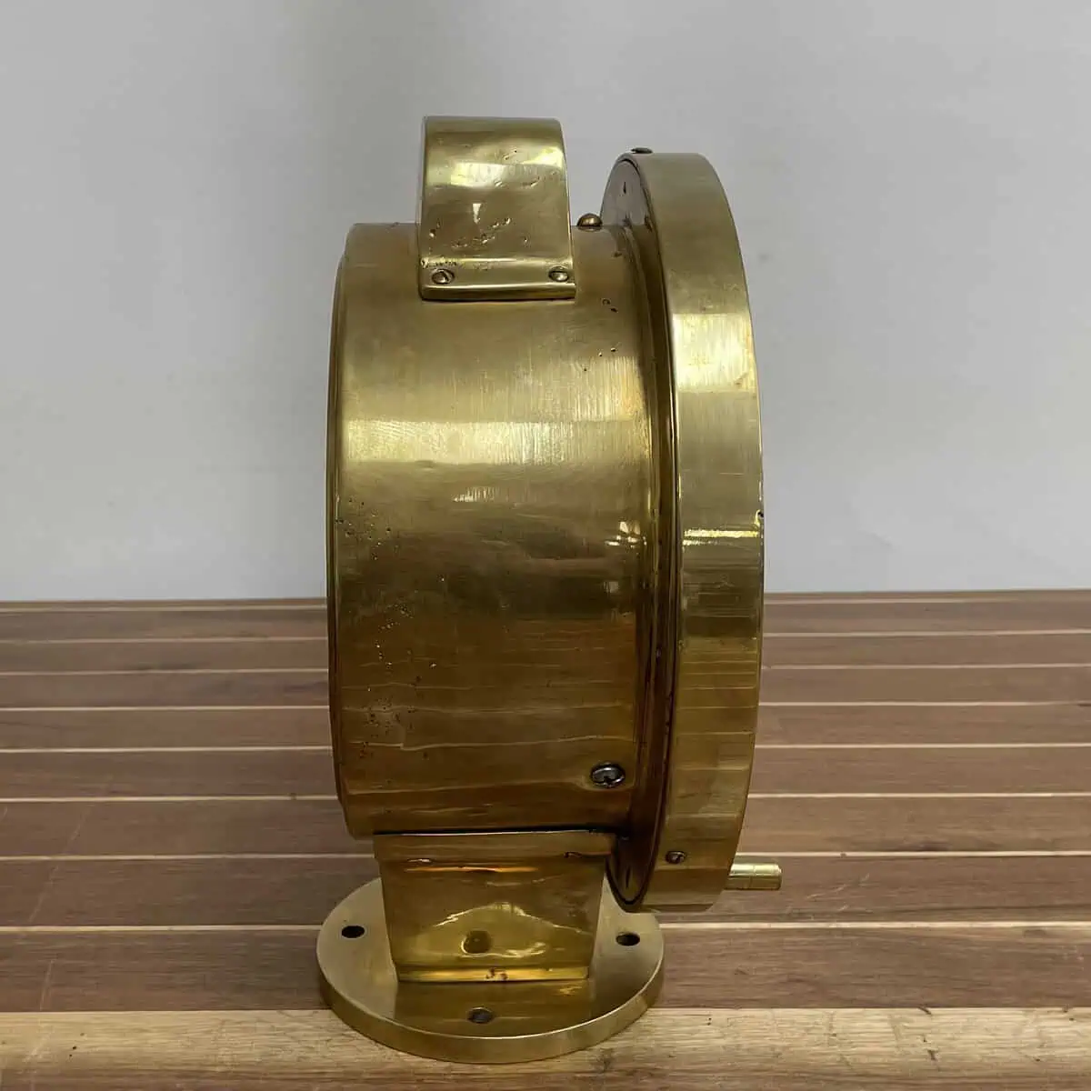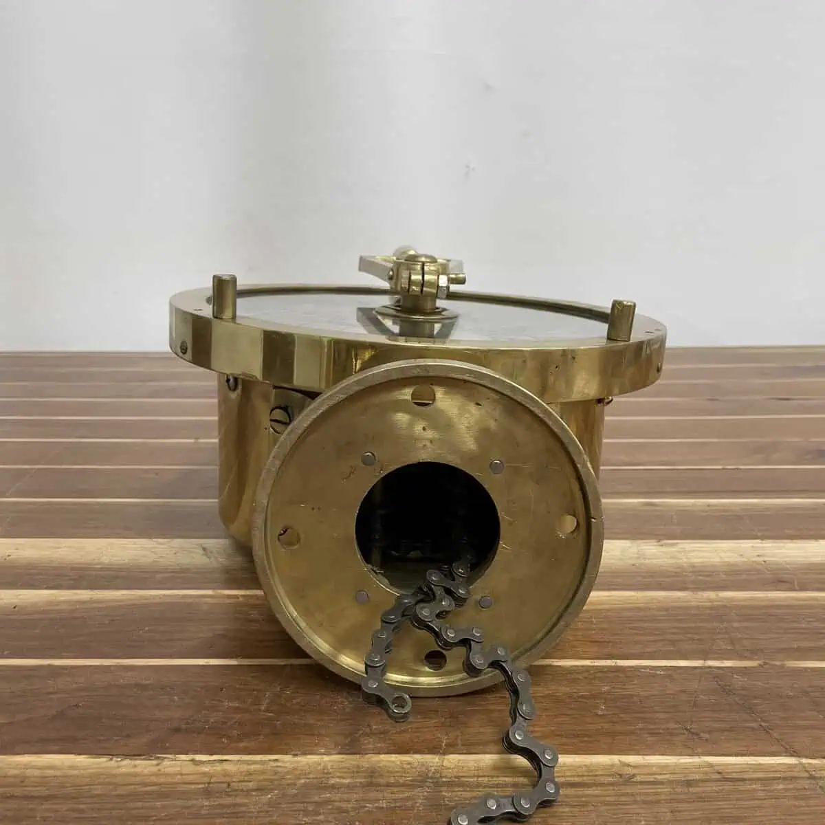 This model is slightly larger than other versions we’ve handled, making it a strong visual piece for display in a home, office, or maritime collection. The brass shows surface scratches and natural patina from years of shipboard service. The glass face remains intact, though some dirt is visible underneath the surface.