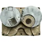 The unit includes geared adjustment controls with marked settings. These controls move internal elements to change magnification or light levels. The base sits flat and includes mounting holes, so you can secure it to a console, table, or display surface. The back is stamped “BB” with serial number 2985.
