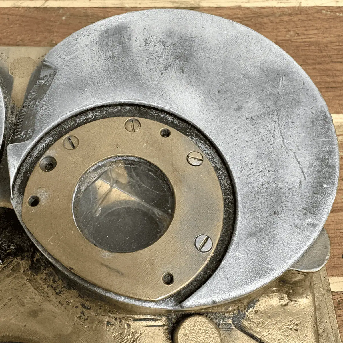 This Dual Marine Optical Viewer is a salvaged instrument designed for shipboard or industrial use. It features a solid brass housing with two eyepieces and adjustable spacing for direct viewing. In addition, the internal optics include multiple lenses that vary in shade from dark to light. These lenses likely reduce glare and improve contrast under different conditions.