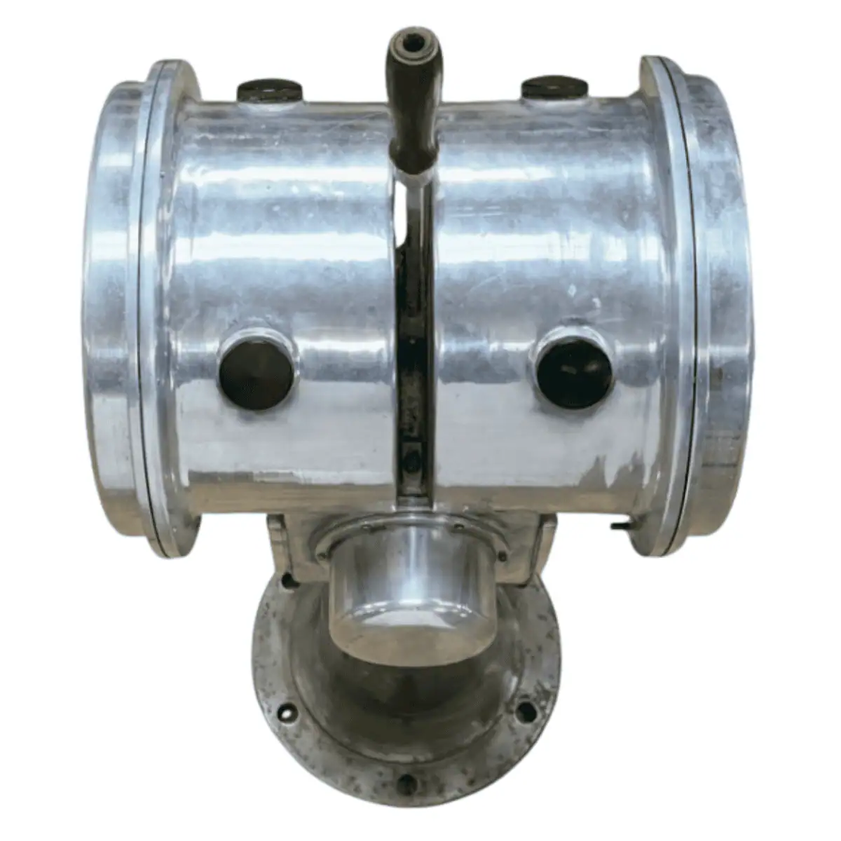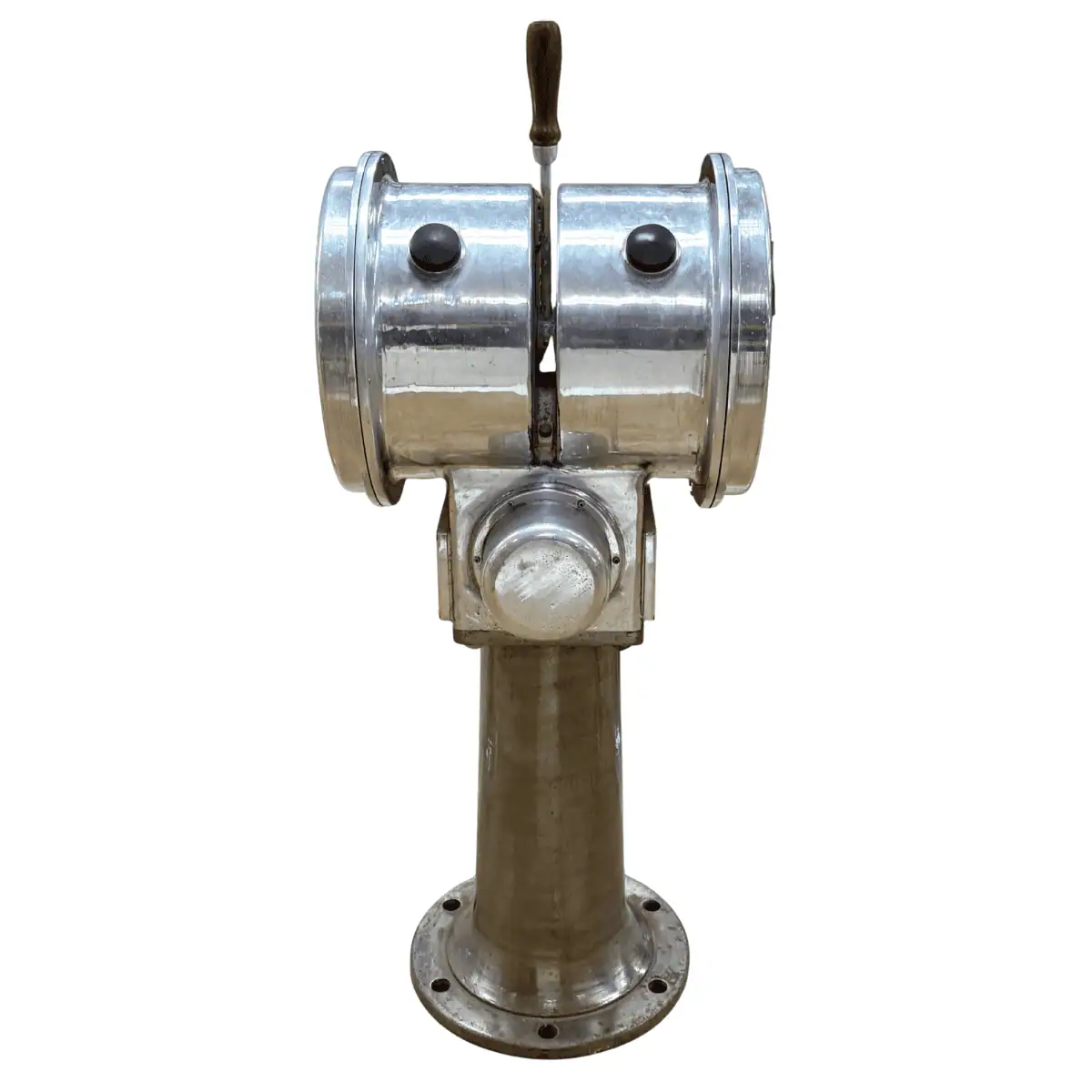The top is aluminum, while the heavy base is iron. Because it was built for life at sea, the body shows natural signs of service. The lever feels stiff to move, and the internal bell no longer rings. We have not tested the unit for full function, so we offer it as a display piece.