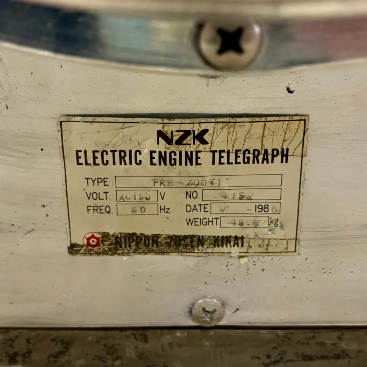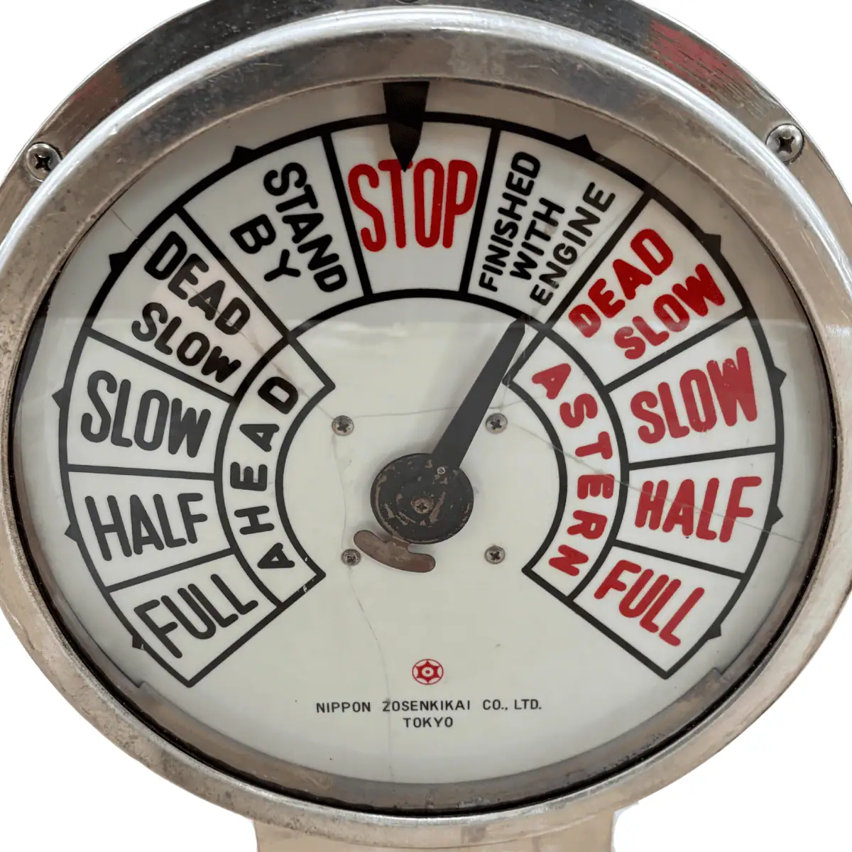 This Vintage Nippon Zosenkikai Ship Telegraph is an authentic piece salvaged from a vessel built in 1986. It once connected the bridge or pilothouse to the engine control room, and it played a vital role in shipboard communication.