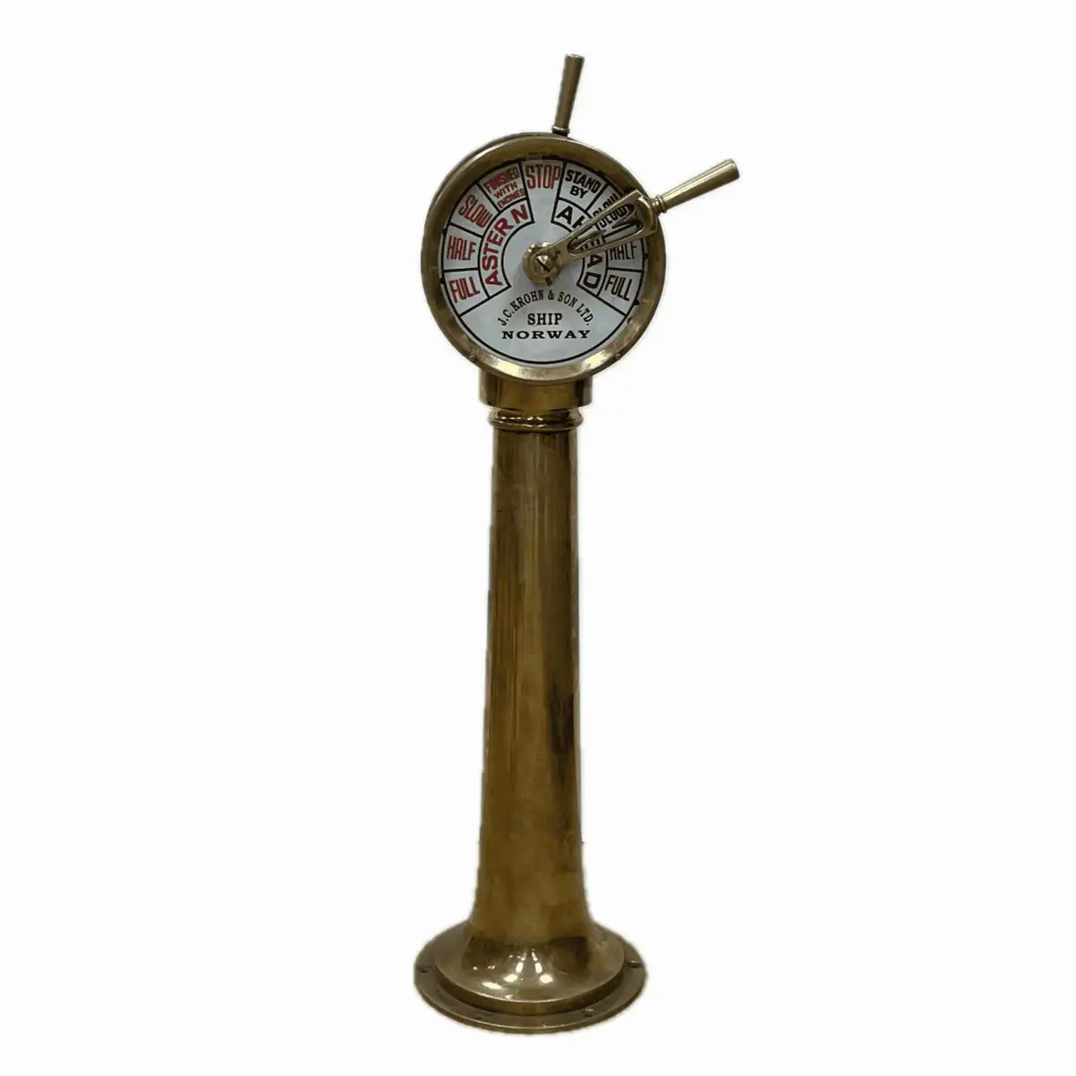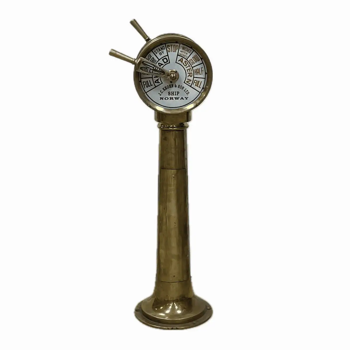 This vintage engine telegraph was salvaged from a working ship and made by J.C. Krohn & Son Ltd., a maritime instrument maker based in Bergen, Norway. Itβs a double-sided vintage engine telegraph with matching engine command faces on both sides β showing FULL, HALF, SLOW, STAND BY, and STOP in both ahead and astern directions. The handles are functional and still produce the original chime when moved.