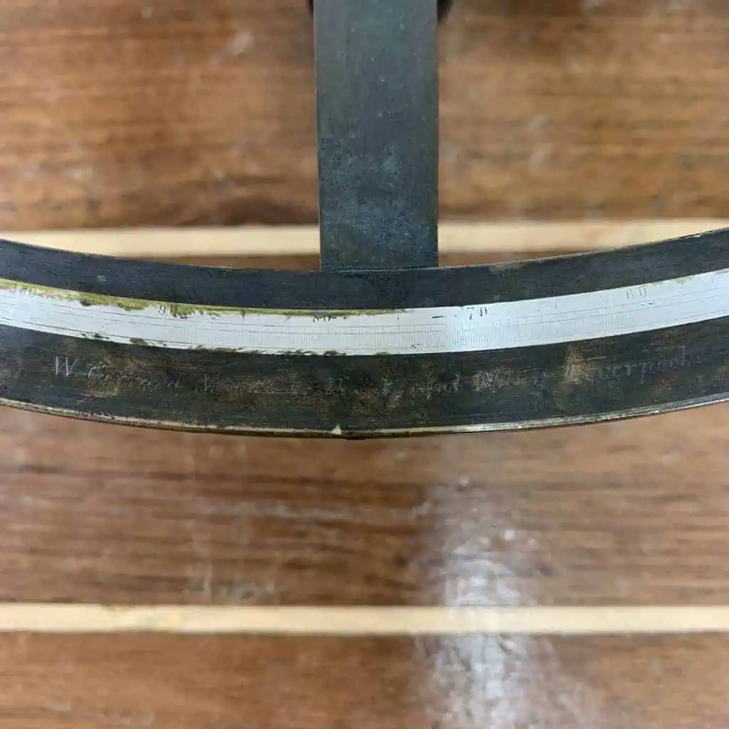 This item was placed in a wood box. You will see that the arc is engraved and it reads: “W. Gerrard Maker to the Royal Navy Liverpool.”