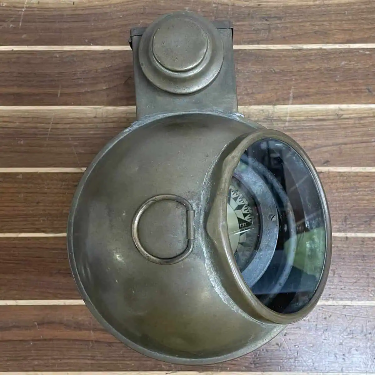 This vintage Sestrel compass came from a working vessel and was made in England. It features a solid brass body with a naturally aged patina. The compass card floats freely in its original fluid, and it still works. This makes it a solid choice for collectors, restorers, or anyone looking for a functional maritime piece.