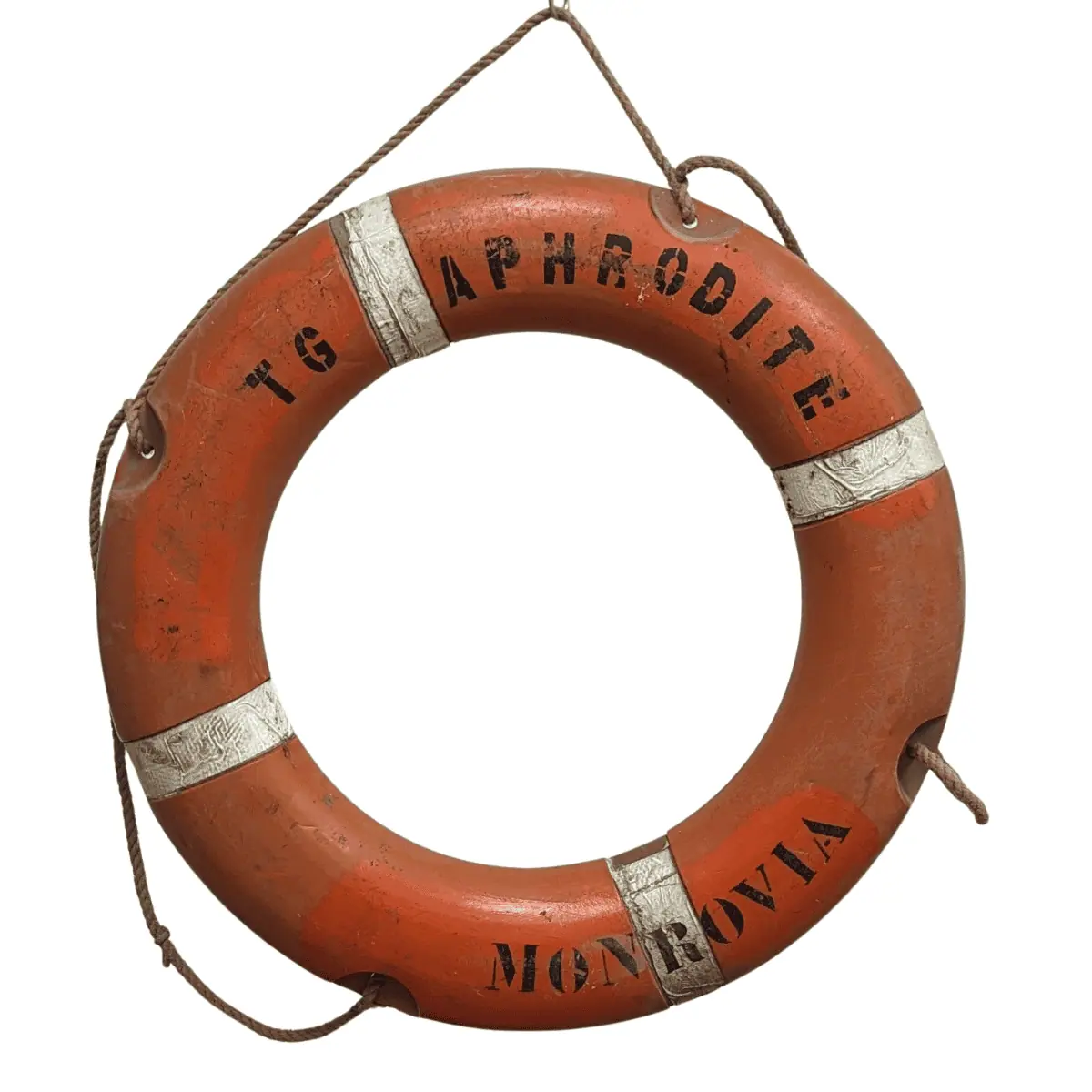 This salvaged life buoy comes from the container ship Aphrodite, built in 1999 and registered under the Monrovia flag. Featuring its original bright orange surface with bold “Aphrodite” and “Monrovia” markings, this life buoy reflects years of service at sea. The white reflective bands and attached rope enhance its authentic maritime character, showing signs of use that make it a perfect nautical collectible or display piece.