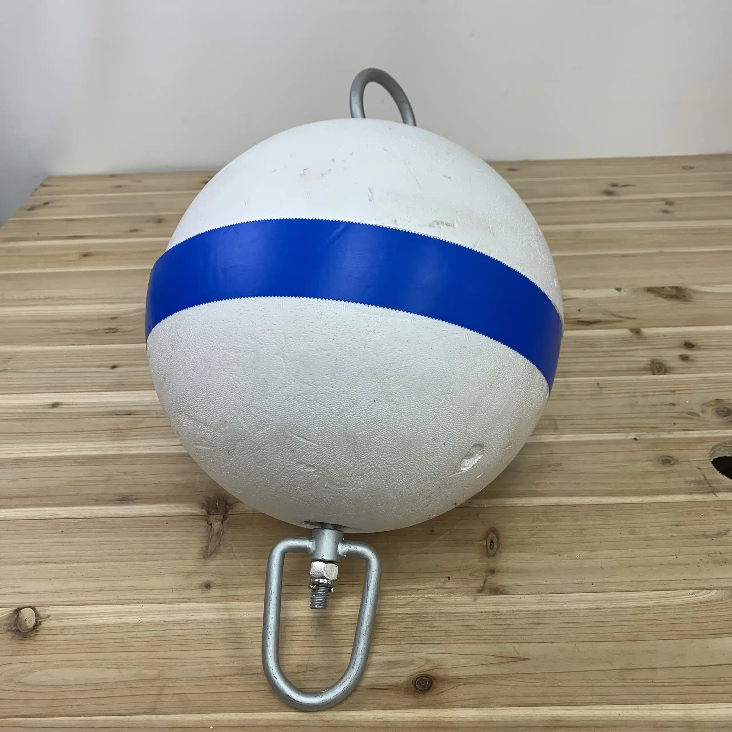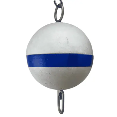 This white and blue mooring buoy was made in the USA and is typically used in marinas or designated anchoring zones. When properly mounted, it’s the only type of buoy vessels are allowed to tie up to. It’s also useful for marking off swim areas in lakes, bays, or other waterways.