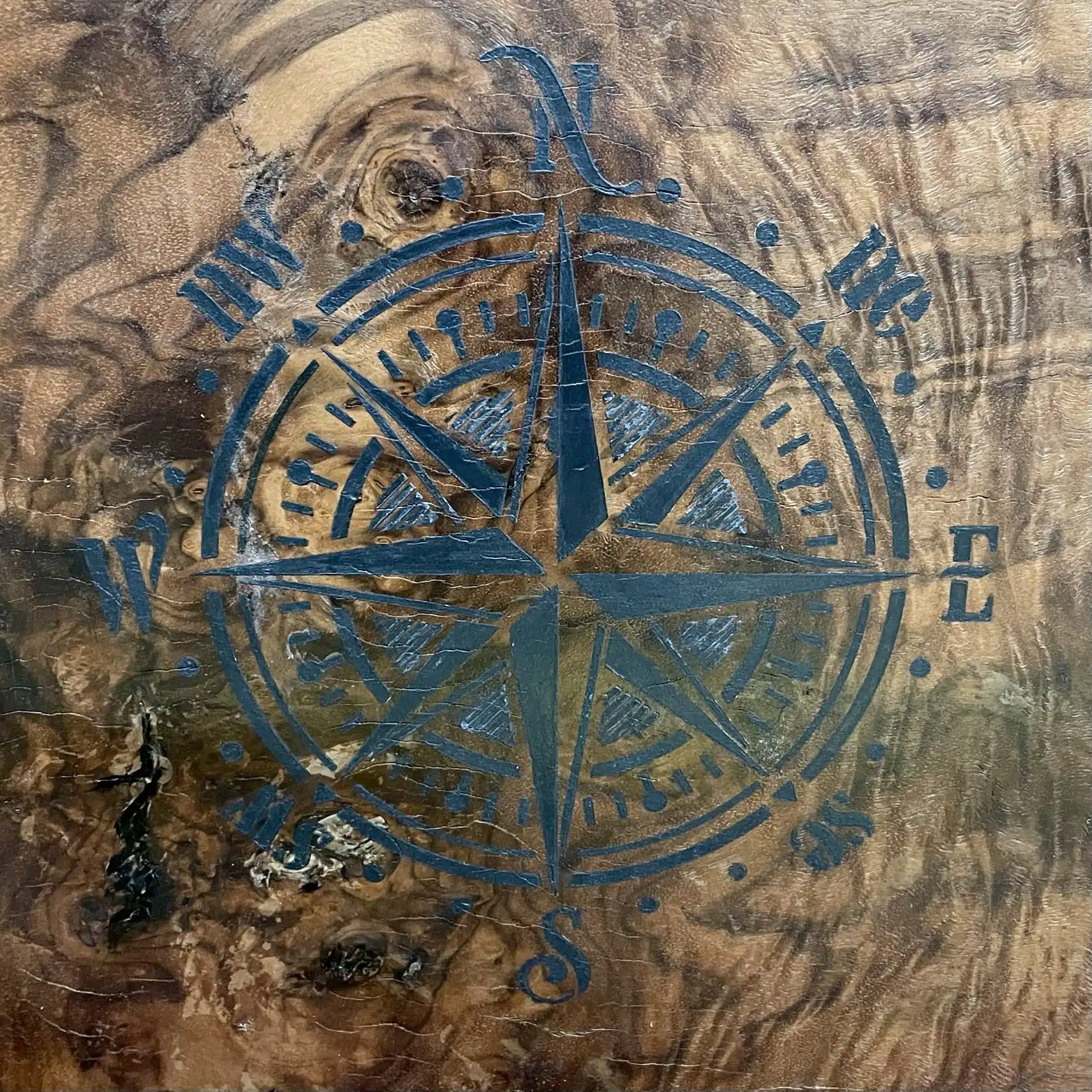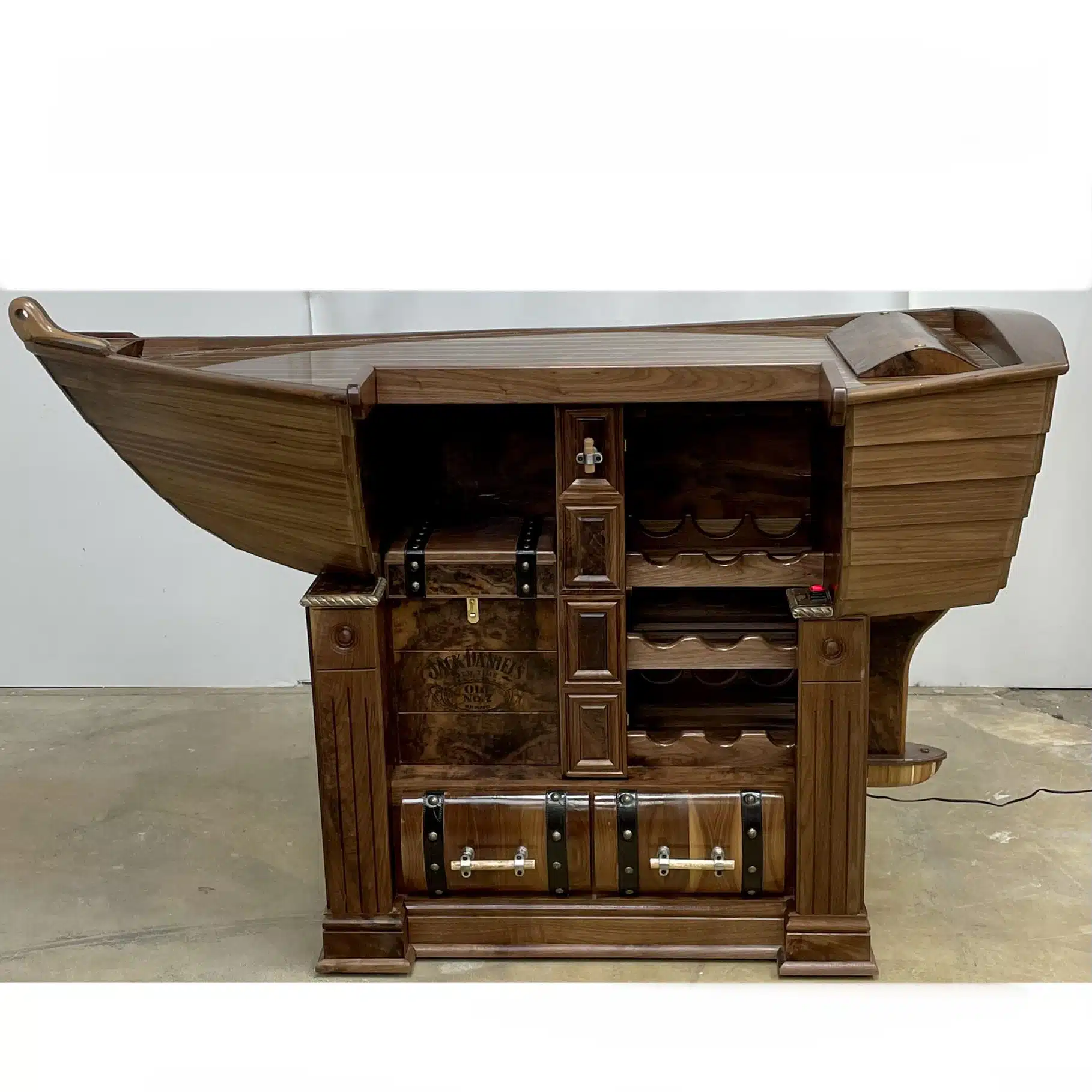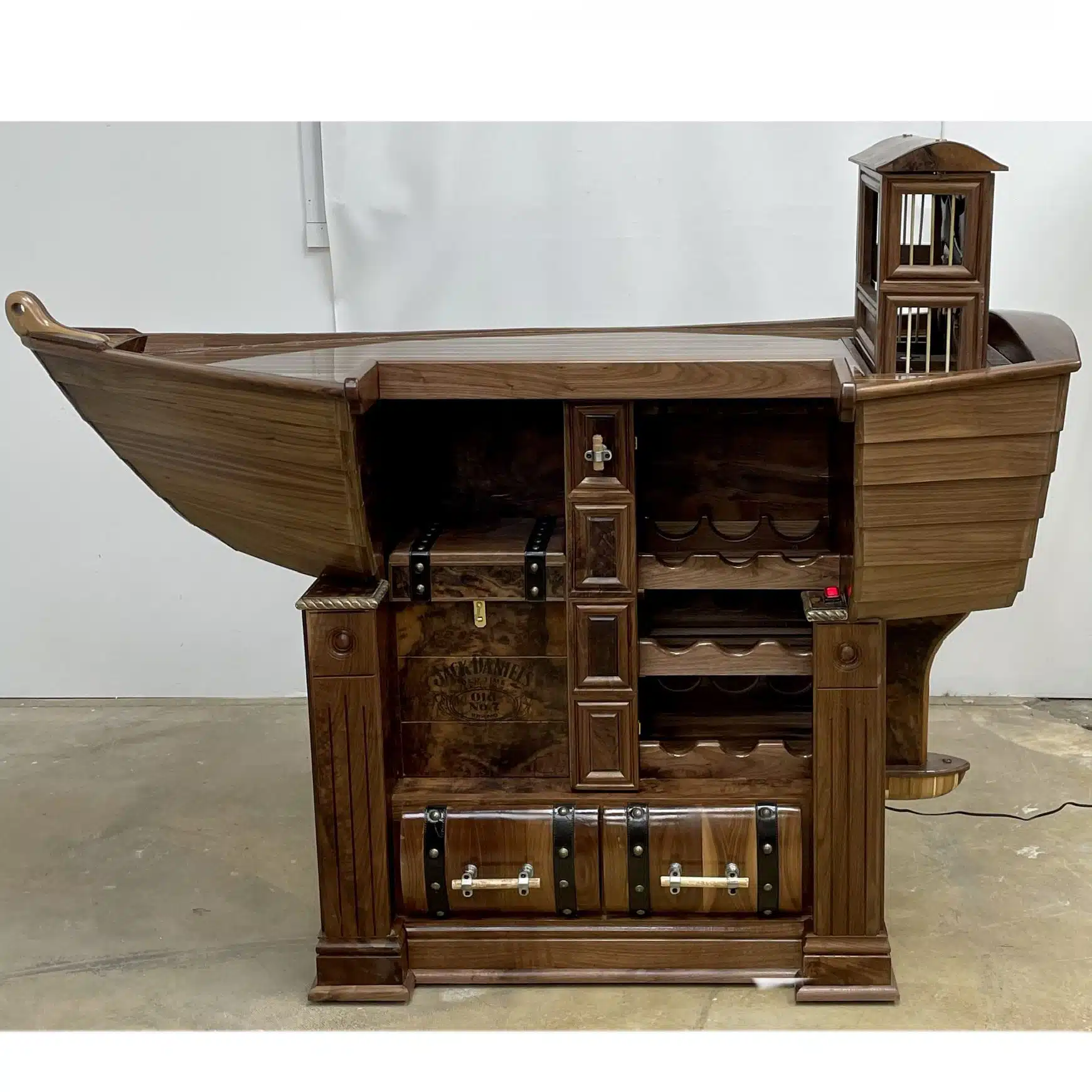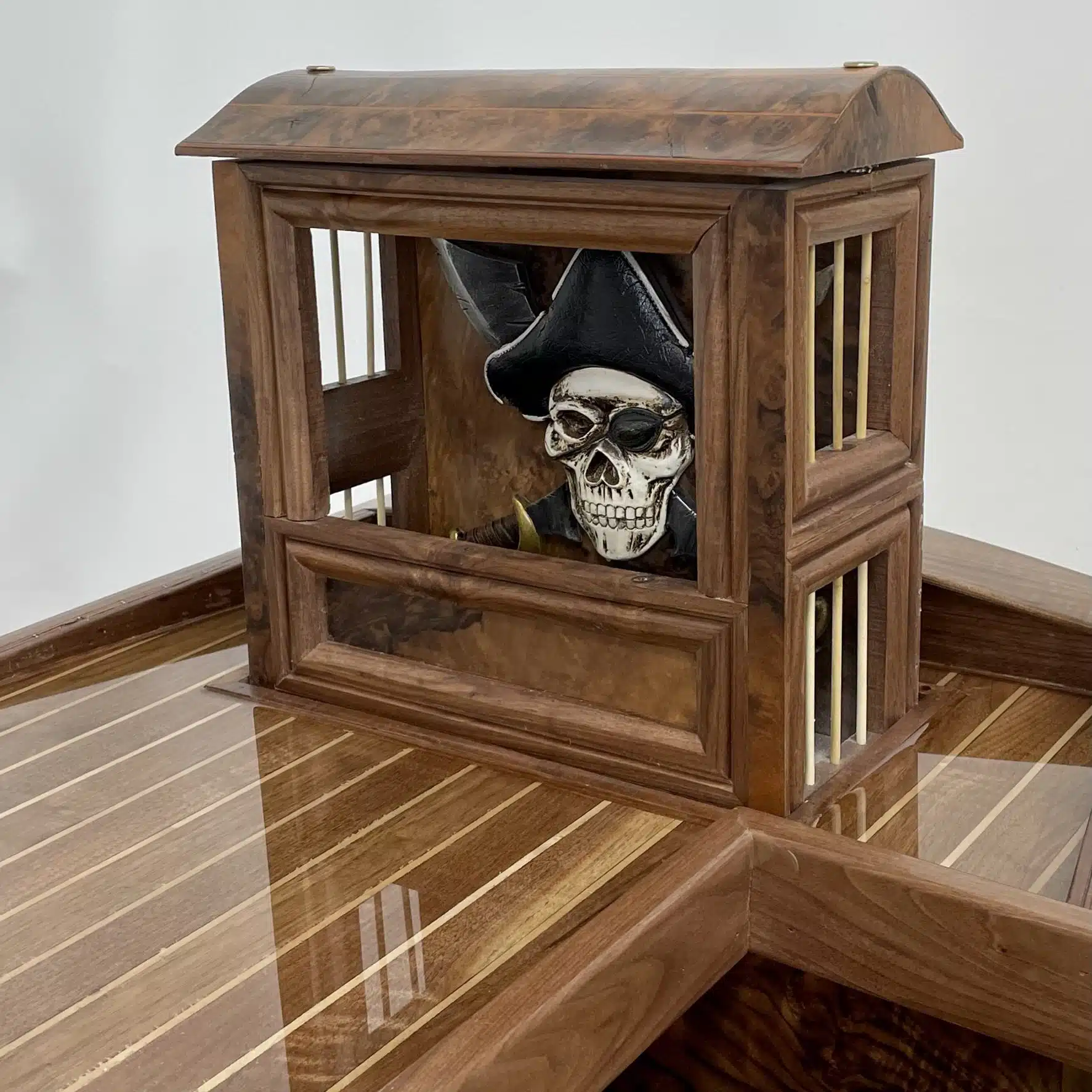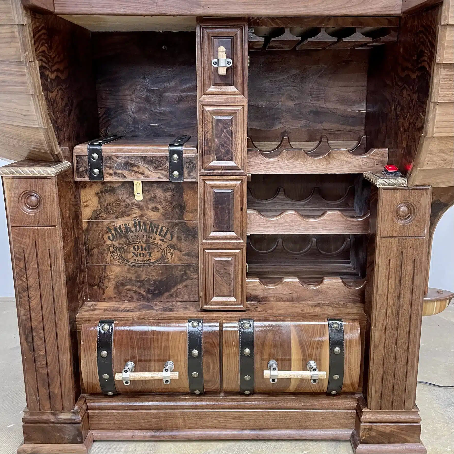 The bar’s dimensions are 68 inches long by 45 inches high and 29 inches at its widest point. The hull is crafted out of hardwood, it measures 68 inches long, 29 inches at its widest, and is 16 inches high. It sits atop a 36.5 inch long by 28.5 inch wide base. The base is crafted out of hardwood and has wheels affixed to the base for easy movement. Attached to the base is a 43.25 inch brass foot rail. There is a large compass rose on the front base of the bar and a Jack Daniels logo on the interior chest. The top features a hydraulic raising piece for internal storage, hidden inside is a skull and crossbones.