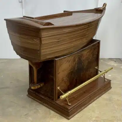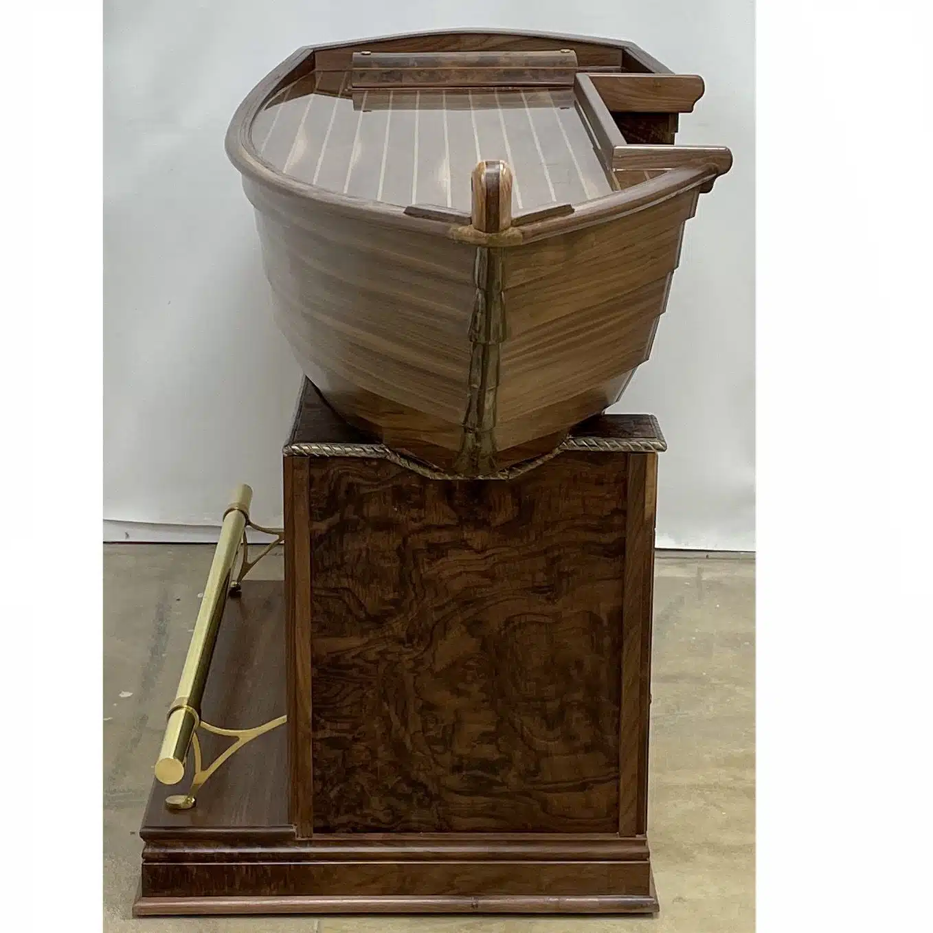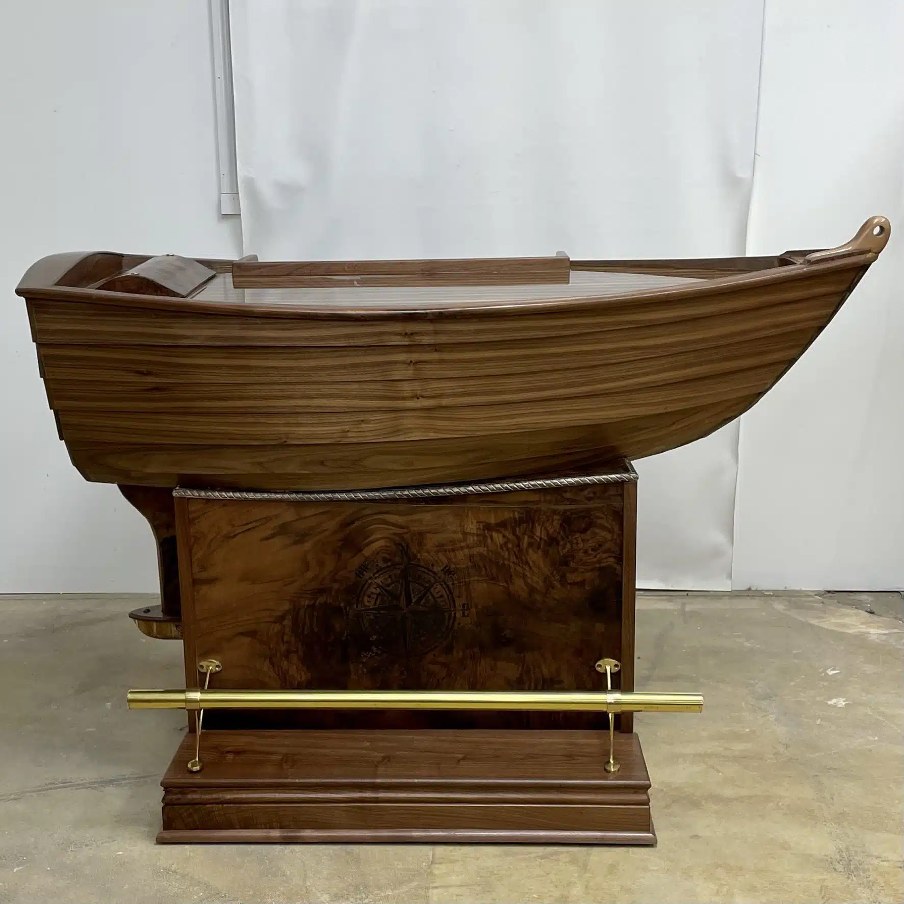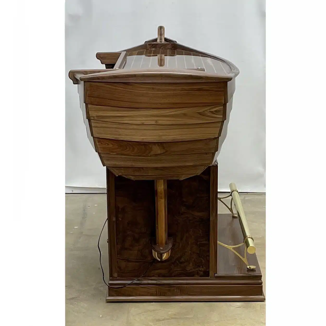 This is a custom one-of-a-kind beautifully handmade Boat Bar. This bar was hand-shaped and formed to resemble the hull of an antique wooden boat. It was crafted similarly to a wooden boat from the formation of the ribs to the steam bending of each plank. It is constructed mainly out of black walnut and burr walnut.