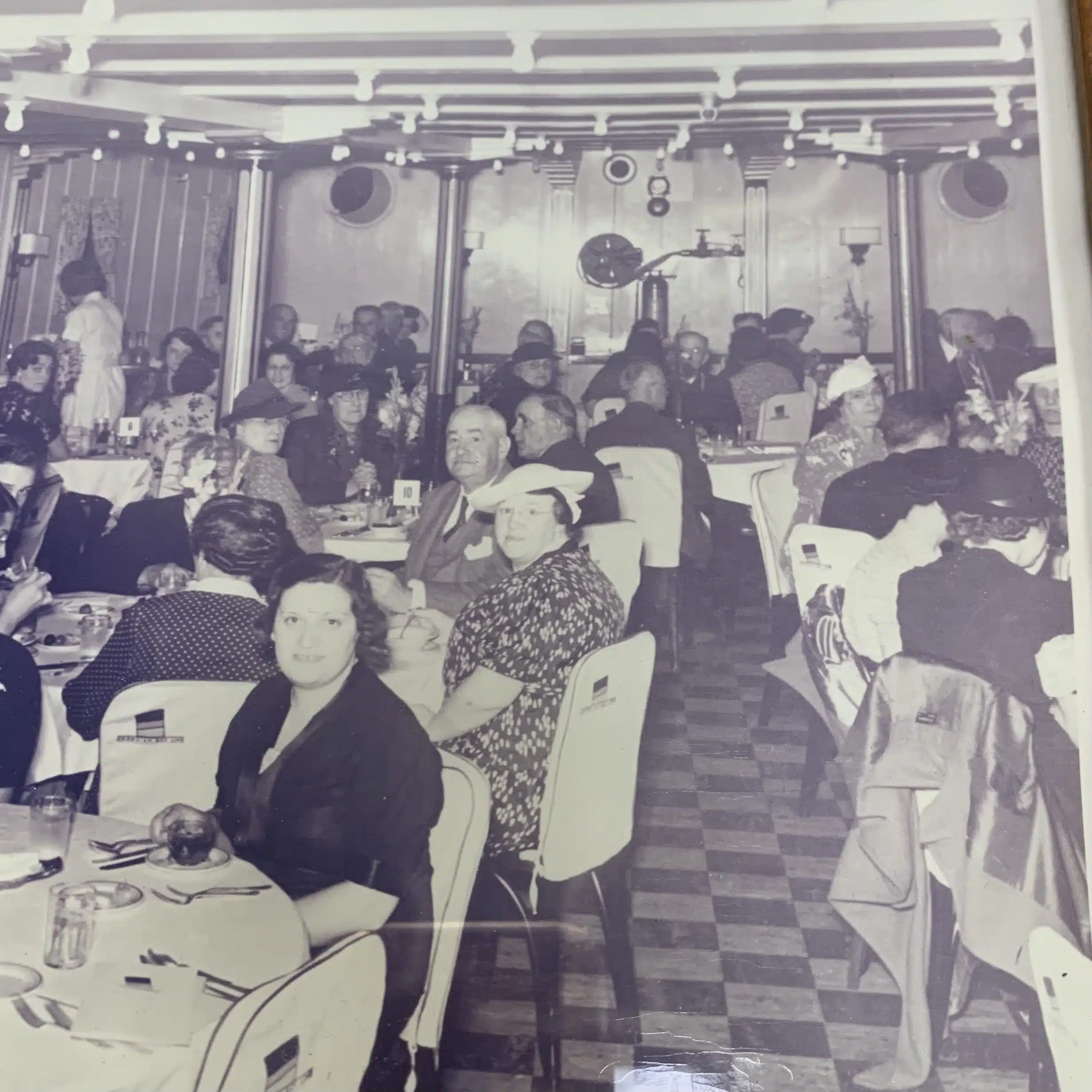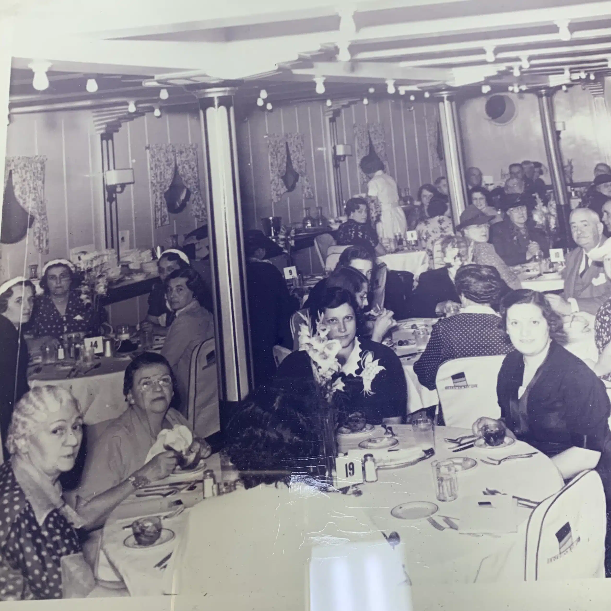 The S.S. South American was launched on February 21, 1914. This photo was taken on the ship in 1950 in the dining room.