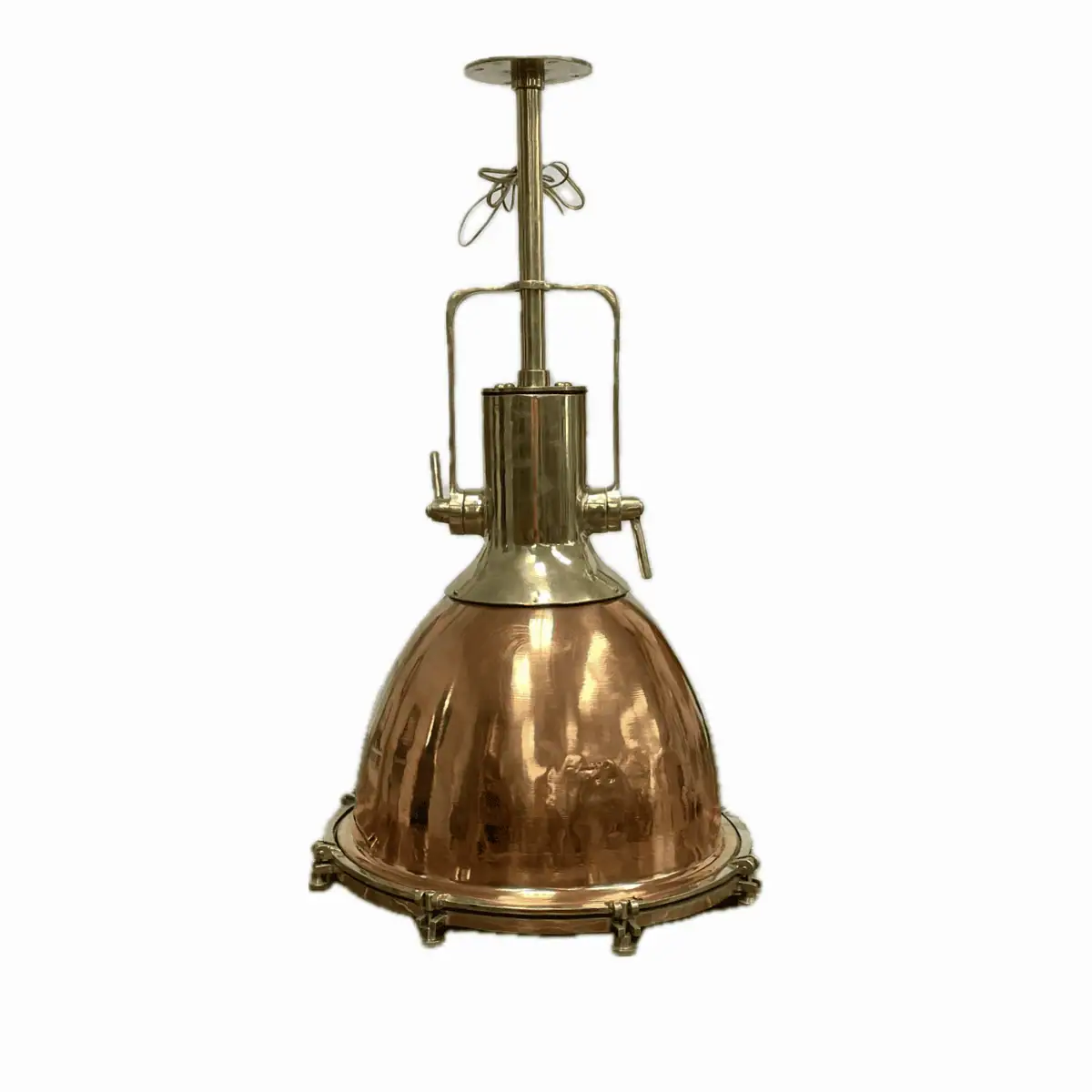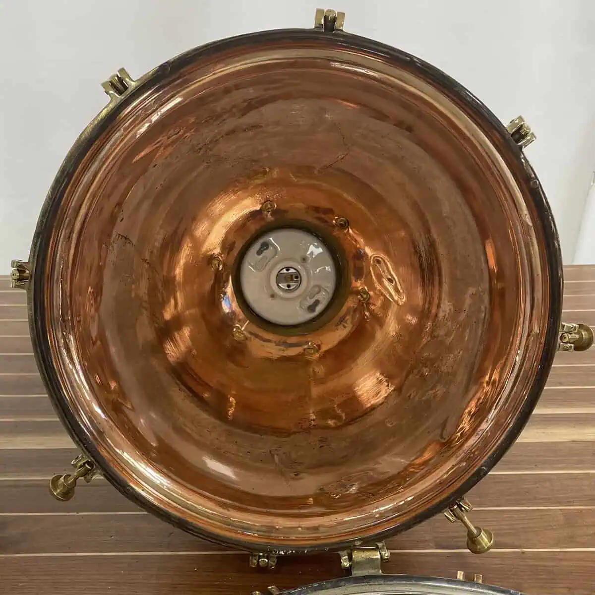This large copper and brass pendant light has a smooth dome with some visible dents and scratches. In addition, there are a few marks inside the light. The brass section at the top also shows some wear. However, these flaws are cosmetic and do not affect how the light functions. This former ship spot light has been around the world and has seen some life on the seas. It adds true character to this nautical light.