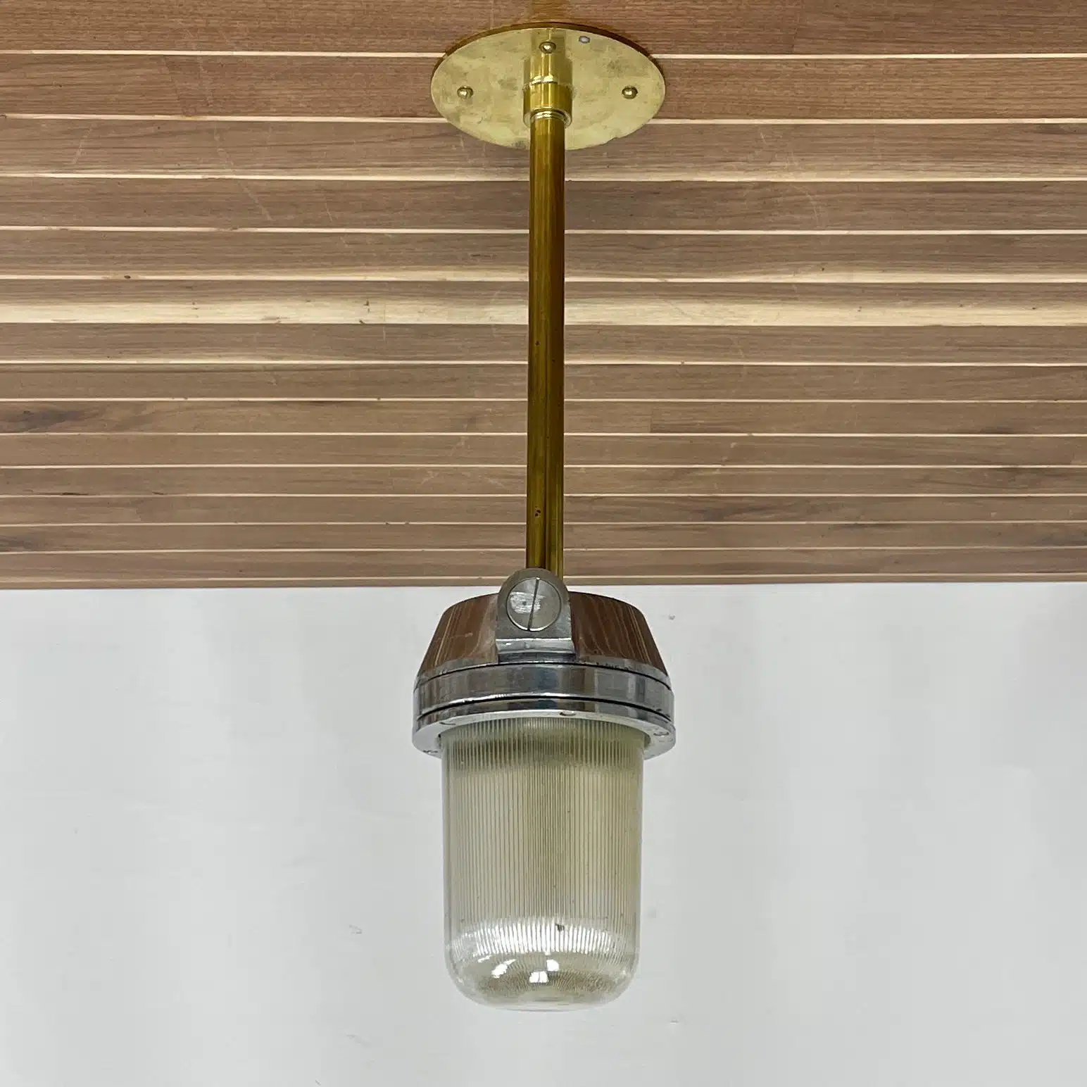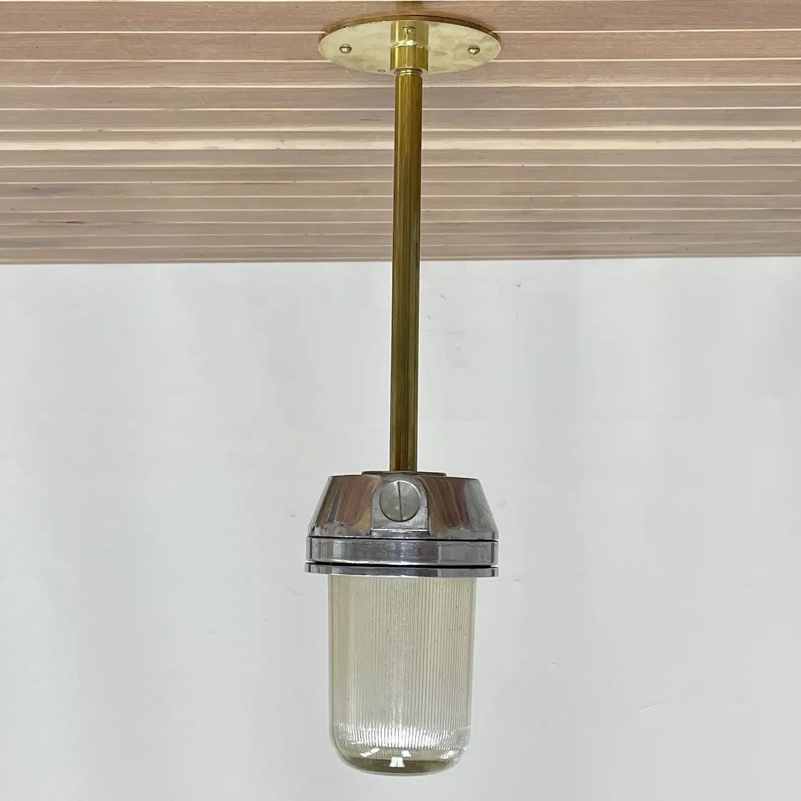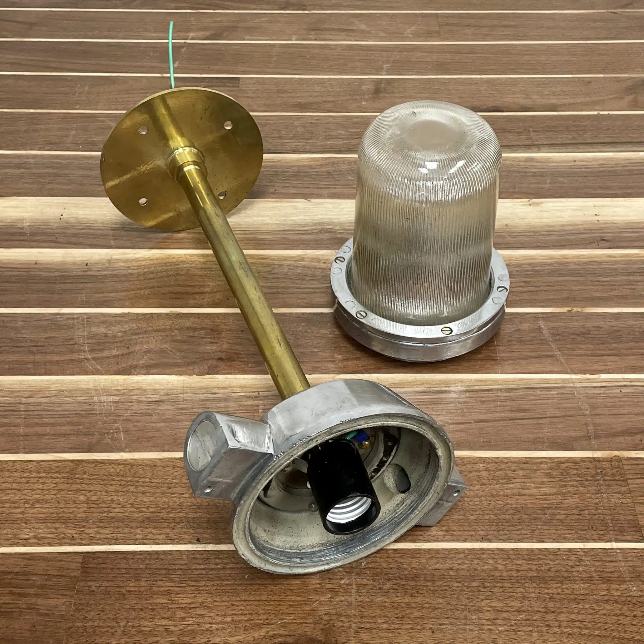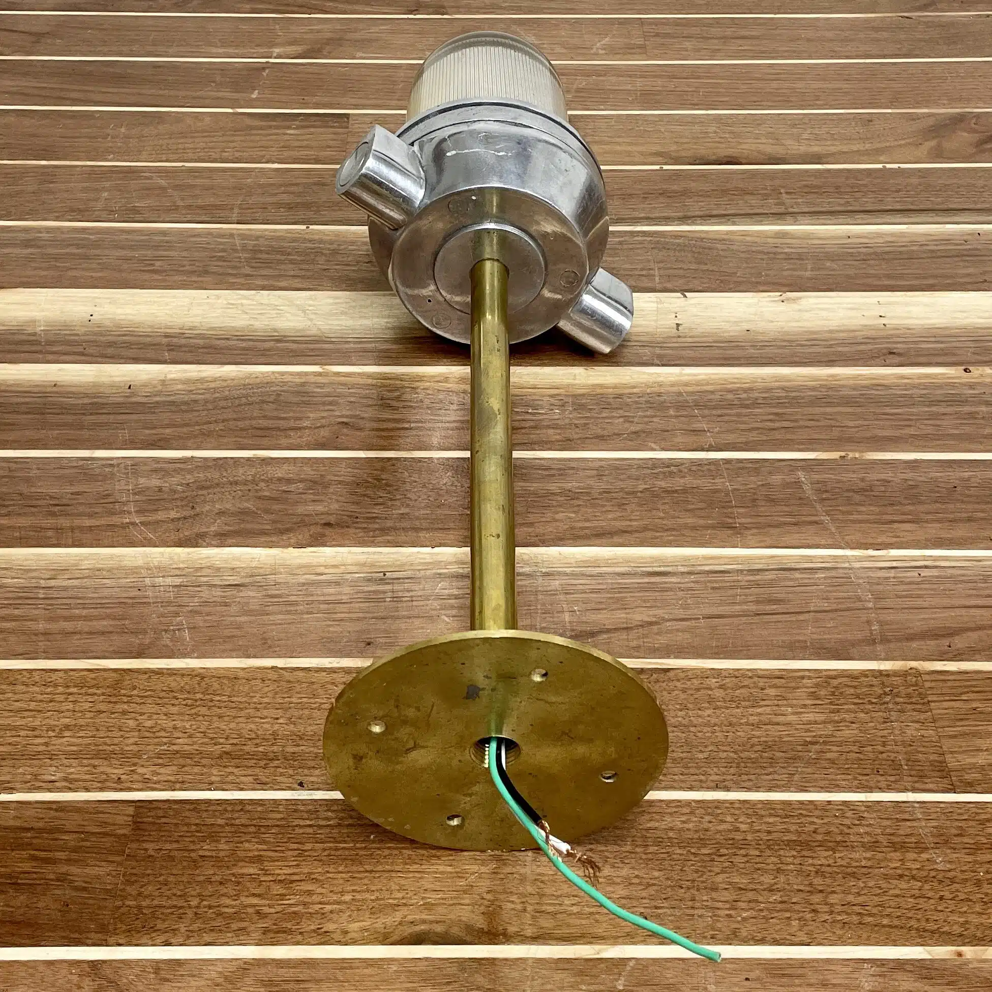 This salvaged and restored aluminum pendant light combines rugged nautical character with modern functionality. Featuring a ribbed aluminum globe and a brass down rod, it brings authentic maritime charm to your space. The plugged side conduits highlight its industrial origins while giving it a clean, streamlined appearance.