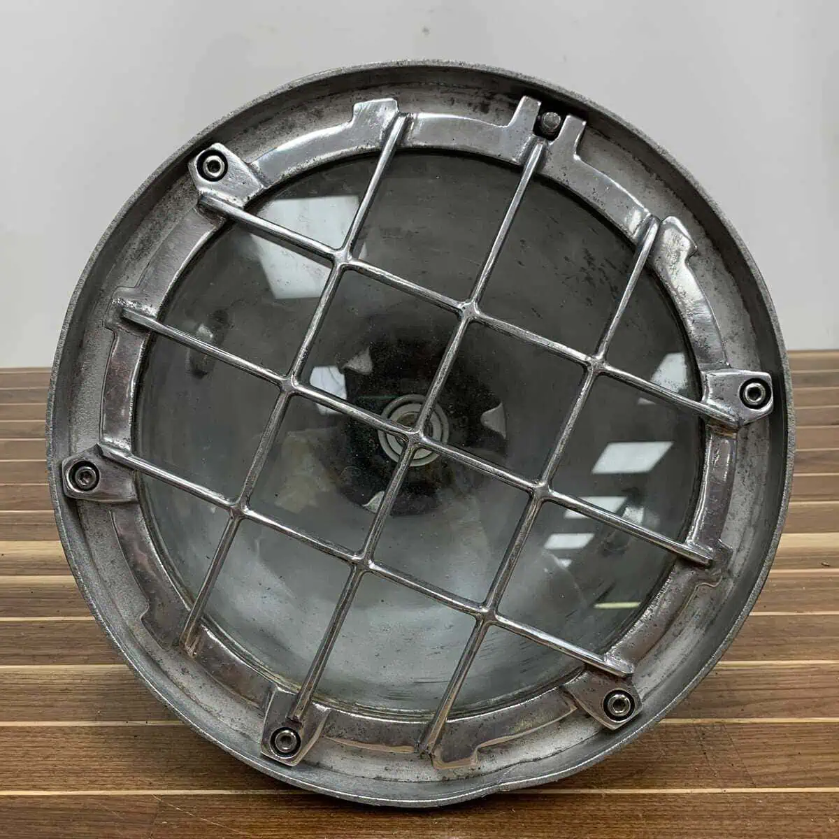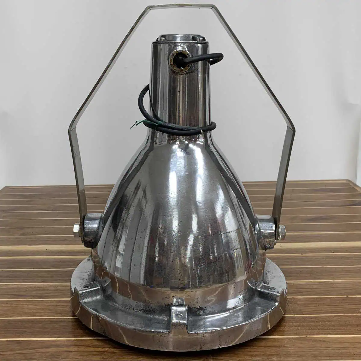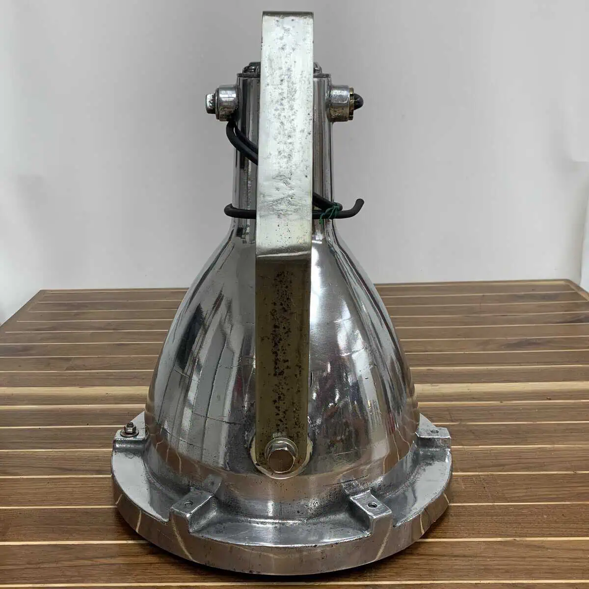 Add industrial strength and salvaged style to your space with this aluminum ceiling light from Koito Manufacturing Co. Made from solid aluminum, it feels heavy and built to last. It shows wear from years of use at sea—small dents, scratches, and patina that add character, not flaws.