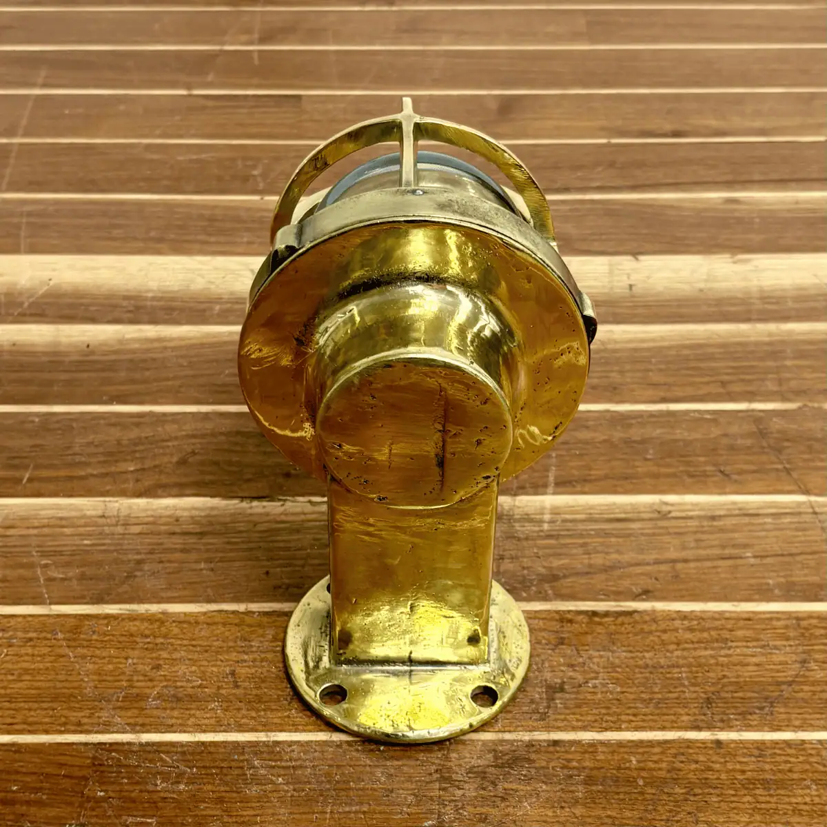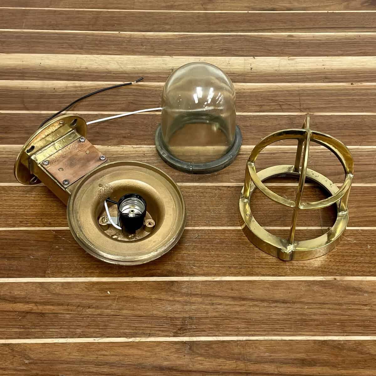 This indoor or outdoor brass wall sconce came from a working ship. We restored it using new wiring and UL-listed parts, so it’s ready for everyday use. The body is solid brass and shows a natural patina from years at sea. As a result, salt air and weather give each one a distinct look.