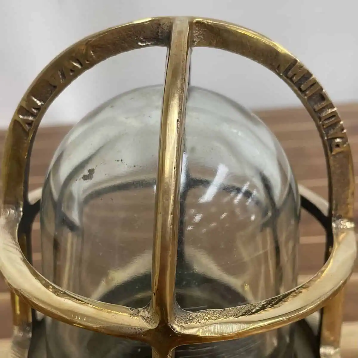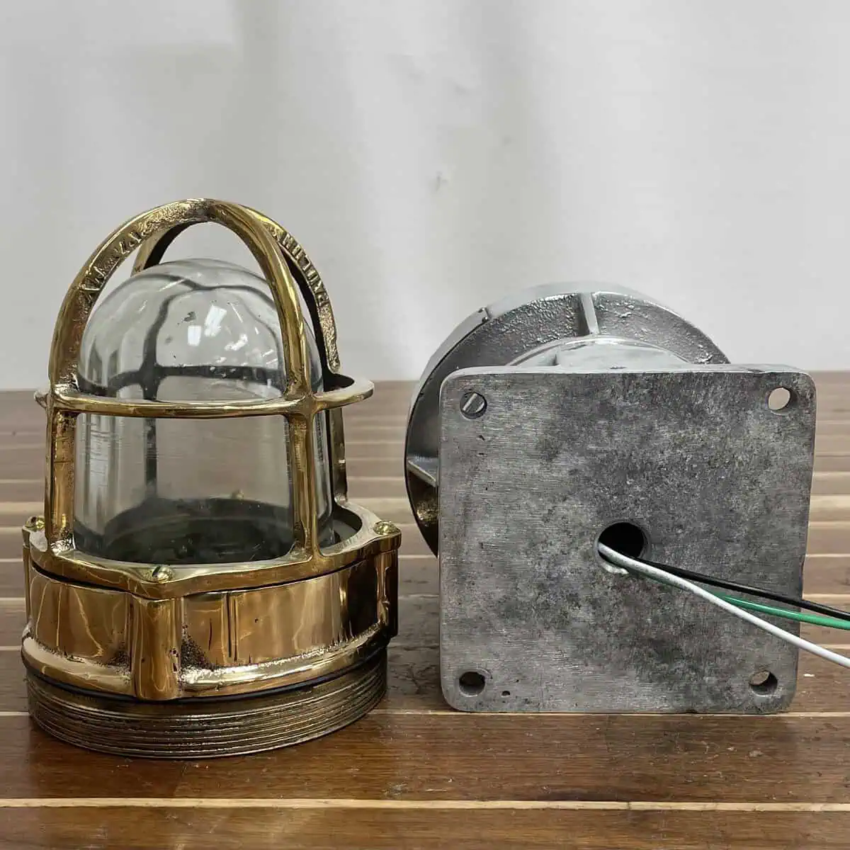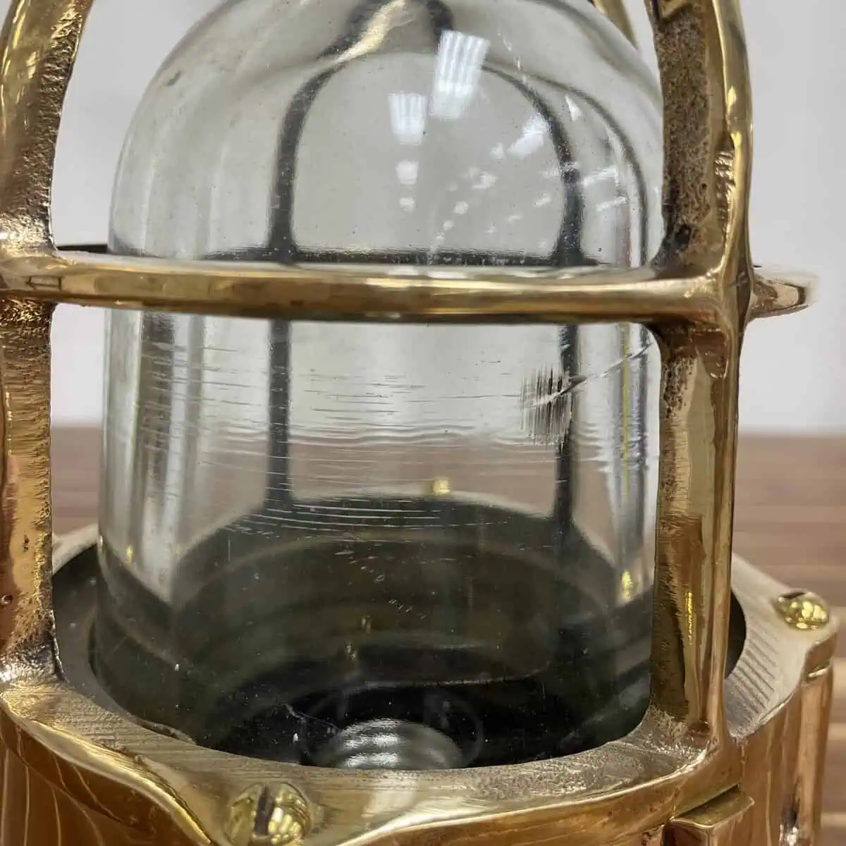 The light features an aluminum base. Its protective cage and cage bottom are solid brass. Inside, a thick clear glass globe offers strong protection for the bulb. While the globe has some surface scratches from past use, these marks don’t affect how it functions.