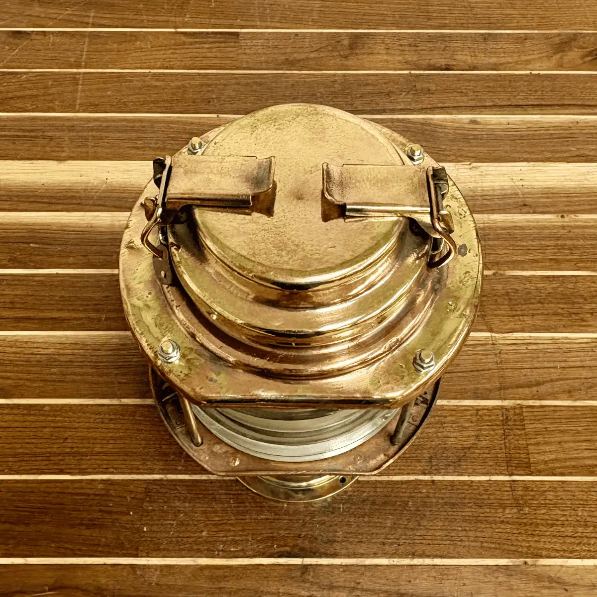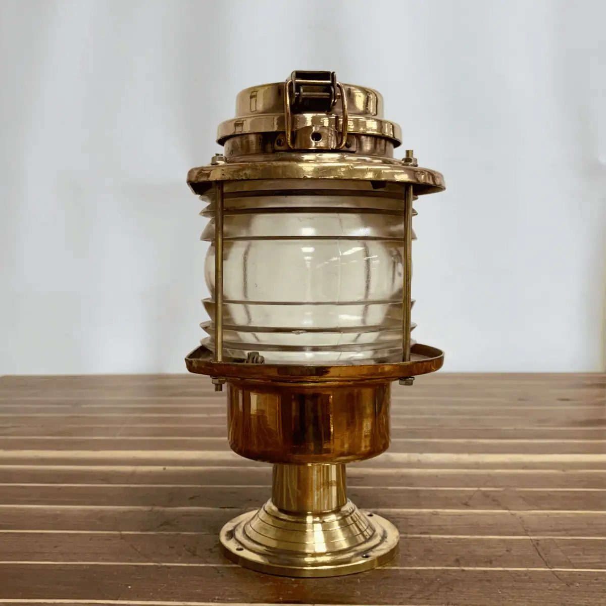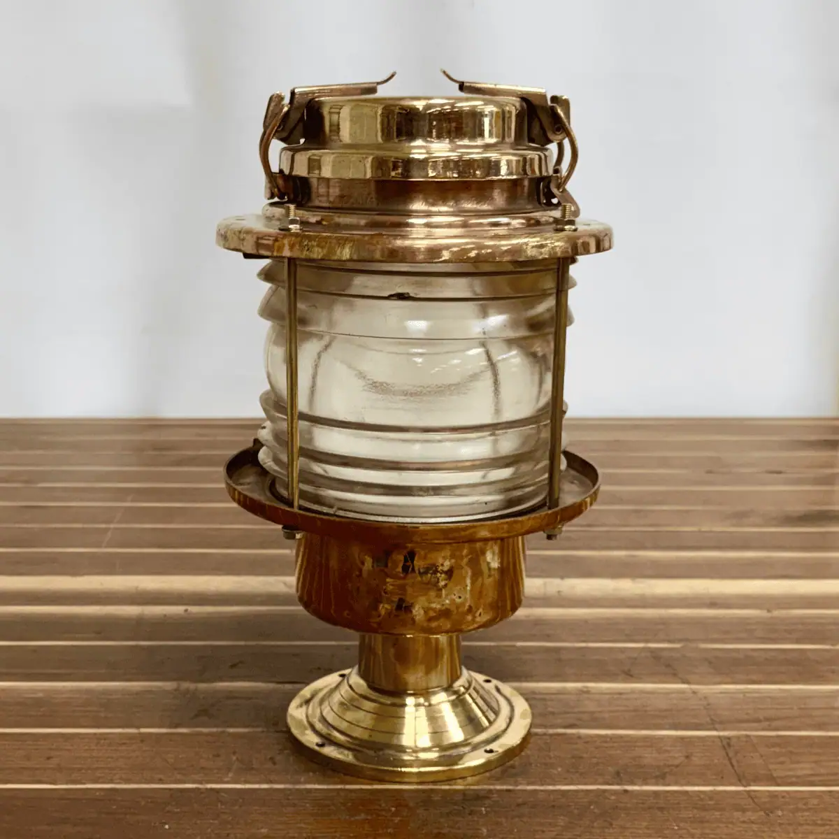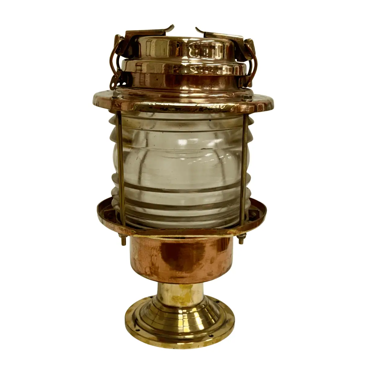 The fixture combines solid brass and copper construction with a clear Fresnel glass lens. As a result, the lens projects light efficiently, although minor chips may remain from original marine service. Meanwhile, the brass and copper surfaces show scratches, wear, and light patina that reflect authentic shipboard use.