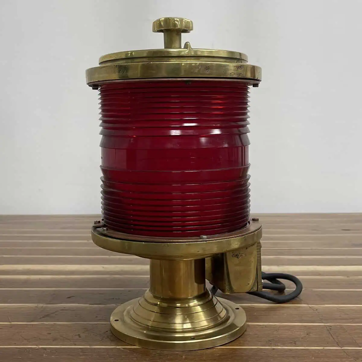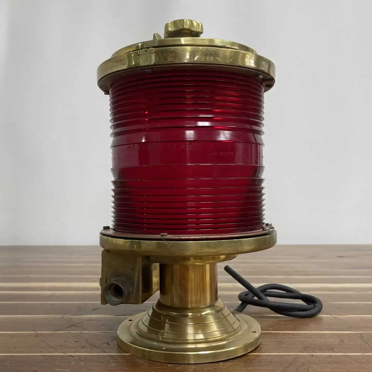This red fresnel post light is authentic ship salvage, once used aboard working vessels or at dockside stations. Built from solid brass, it features a bold red Fresnel lens that was originally designed for visibility in critical maritime zones. These lights often marked port side positions or restricted areas, which made the red lens an essential part of onboard navigation.