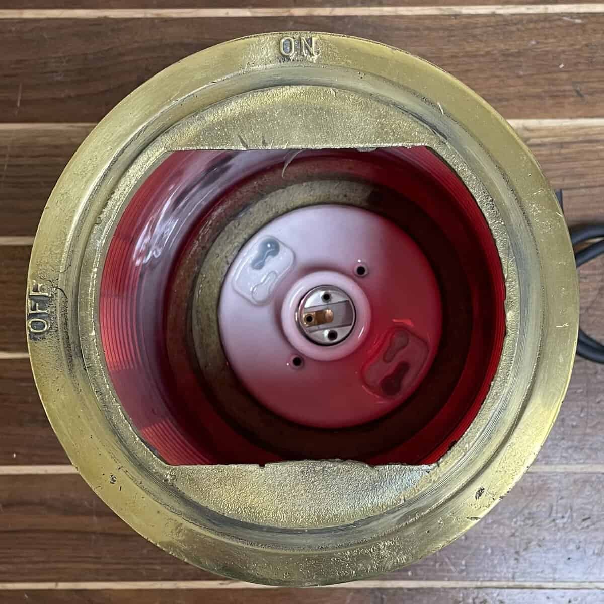 The red Fresnel lens will show some chips in the glass from its time in service. These surface flaws don’t affect the function of the light and are typical for salvaged pieces. The brass housing also shows wear and patina, adding to its authentic character.