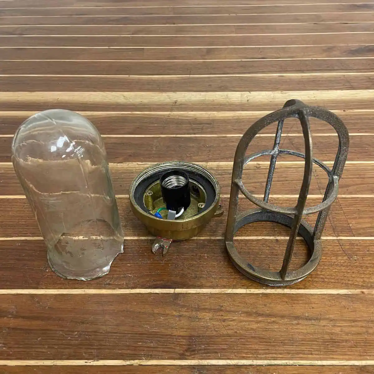 The design includes a brass cage that protects a clear glass globe. In some units, the globe stands taller, while others are slightly shorter. In addition, several globes show chips or breaks along the bottom rim. This type of wear is consistent with shipboard use over time.