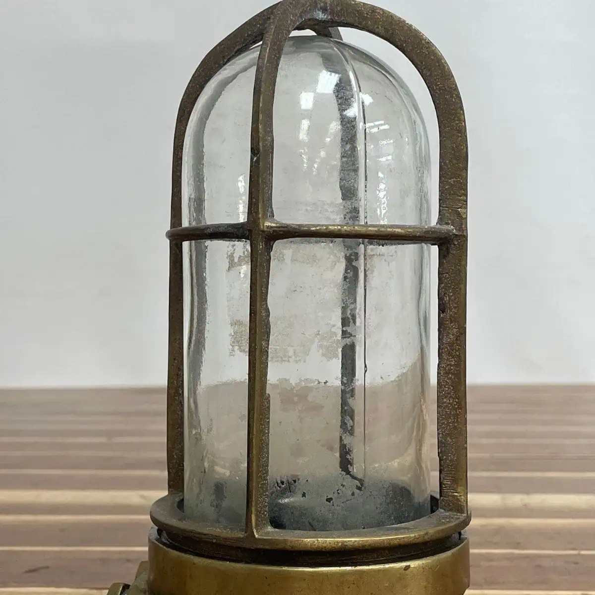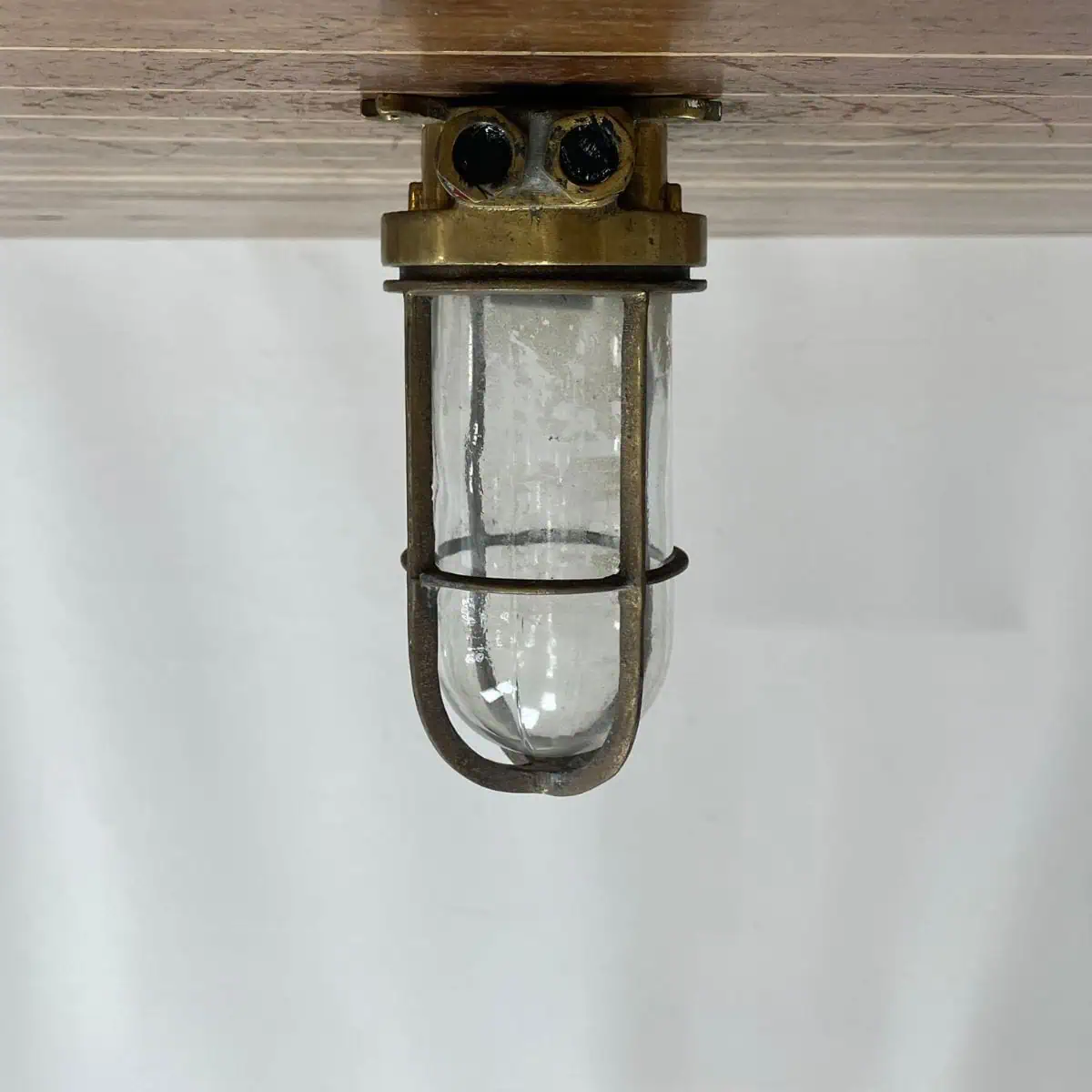 These lights were commonly installed in ship passageways and utility areas. The cage and thick glass helped protect the bulb in tight, high-traffic spaces.