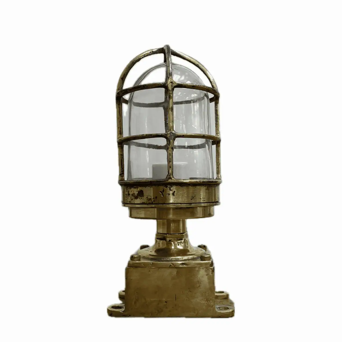 The glass globe protects the bulb and spreads light evenly. In addition, it helps shield the socket from moisture and debris. Because this piece comes from a marine setting, the brass and glass often show natural wear. As a result, each fixture has its own patina and surface marks from prior service.