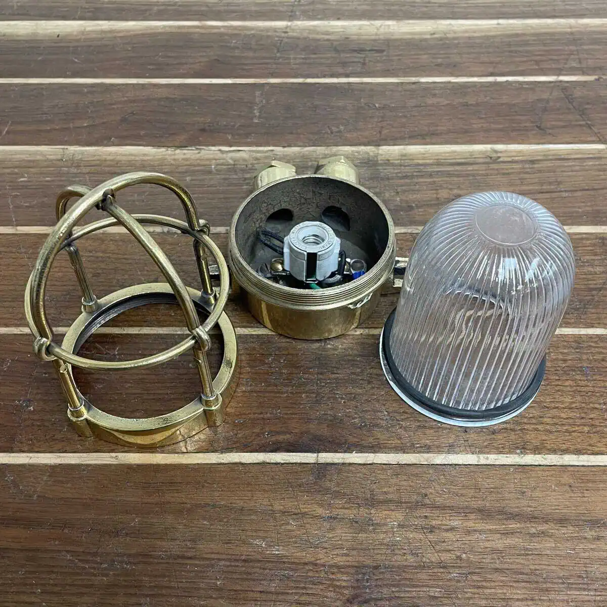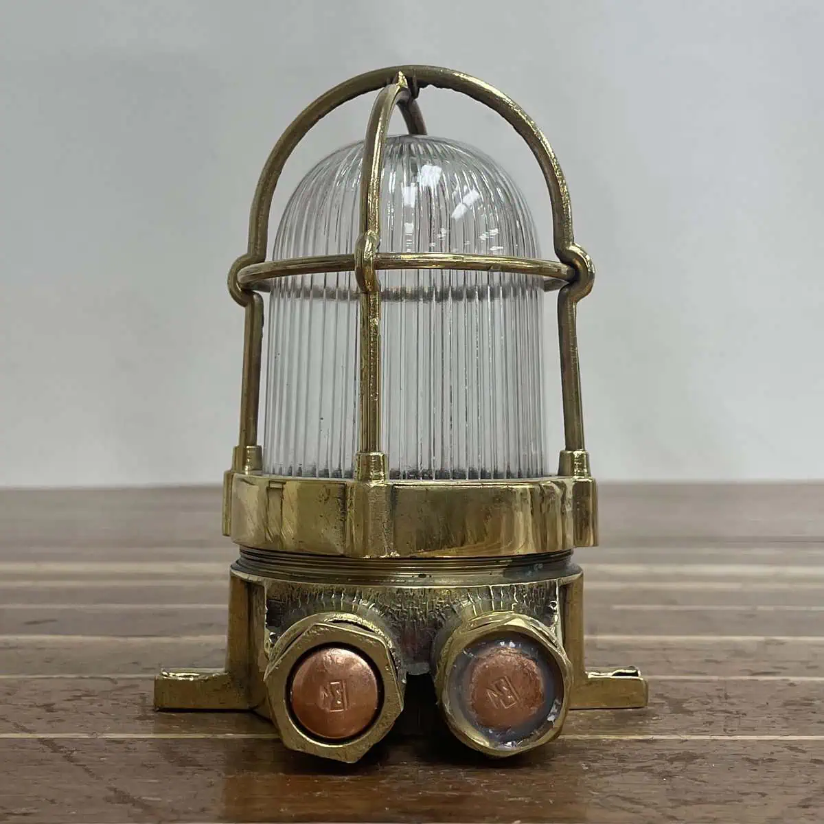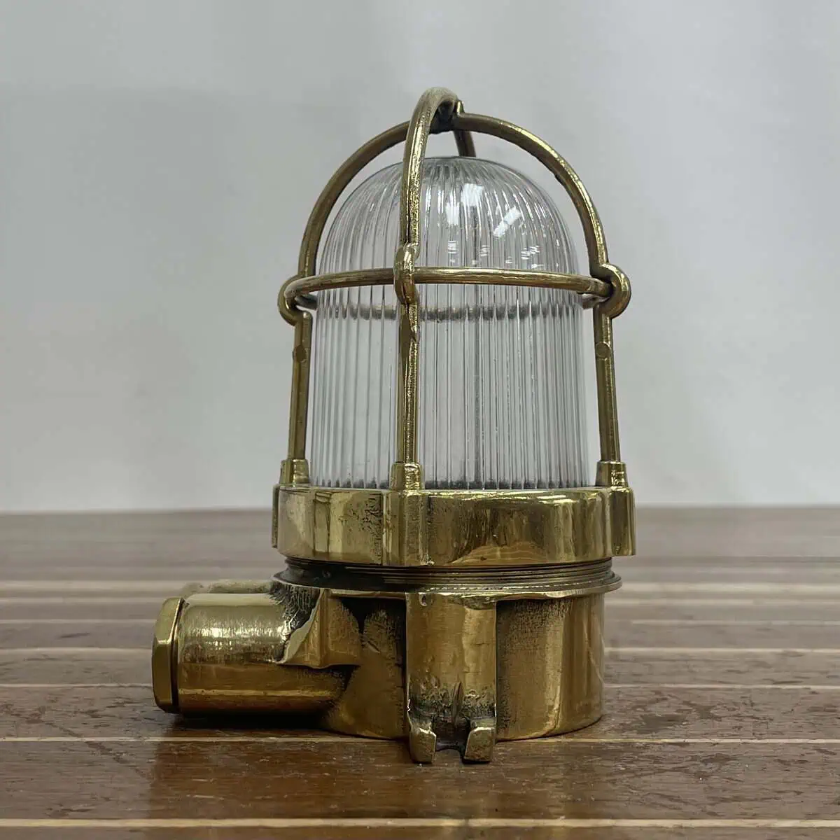 This Mini Brass Caged Ceiling Light brings a durable and compact lighting option to both indoor and outdoor settings. Ships originally used these lights in passageways for their rugged design and weather-resistant construction.