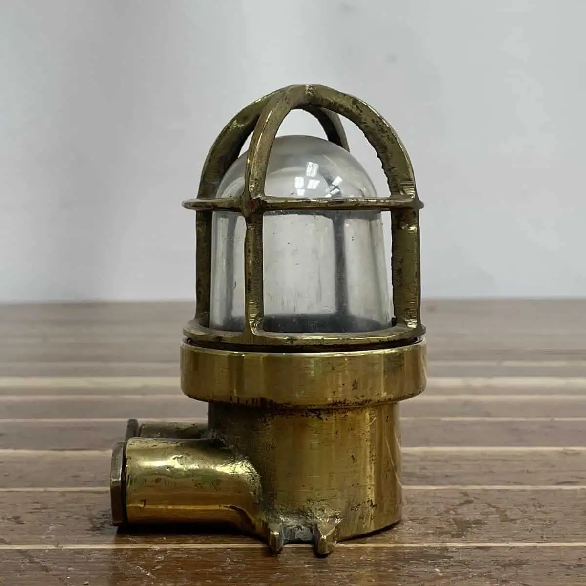 Ship crews painted over the brass body and cage to cut down on polishing. You’ll see remnants of that original red paint still visible on both pieces. The light has a solid brass body, a caged glass dome, and a simple design that stays true to its working ship origins.