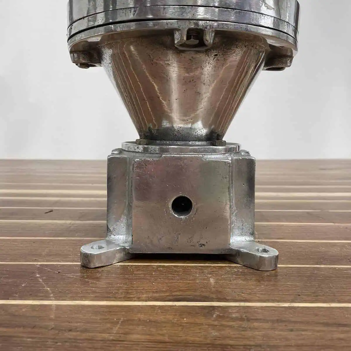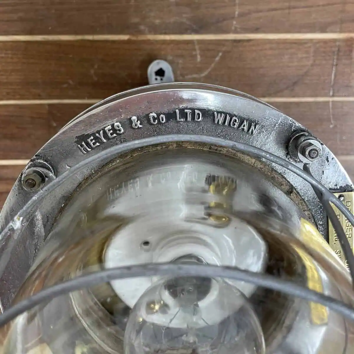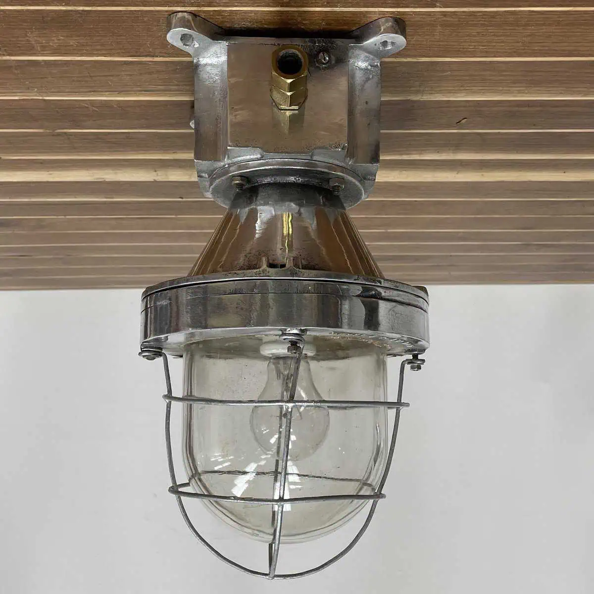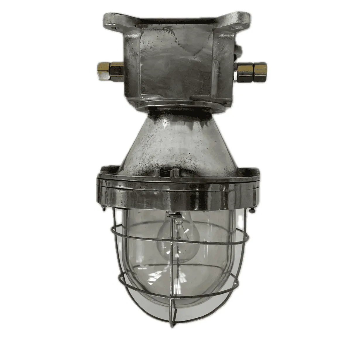 Here is our Solid Aluminum Ceiling/Post Light, made by Heyes & Co. LTD Wigan. This versatile light serves as both a ceiling fixture and a post light. The aluminum shows signs of wear, and the yellowish-brown glass globe has aged. The photos reveal a slightly bent cage and removable brass plugs.