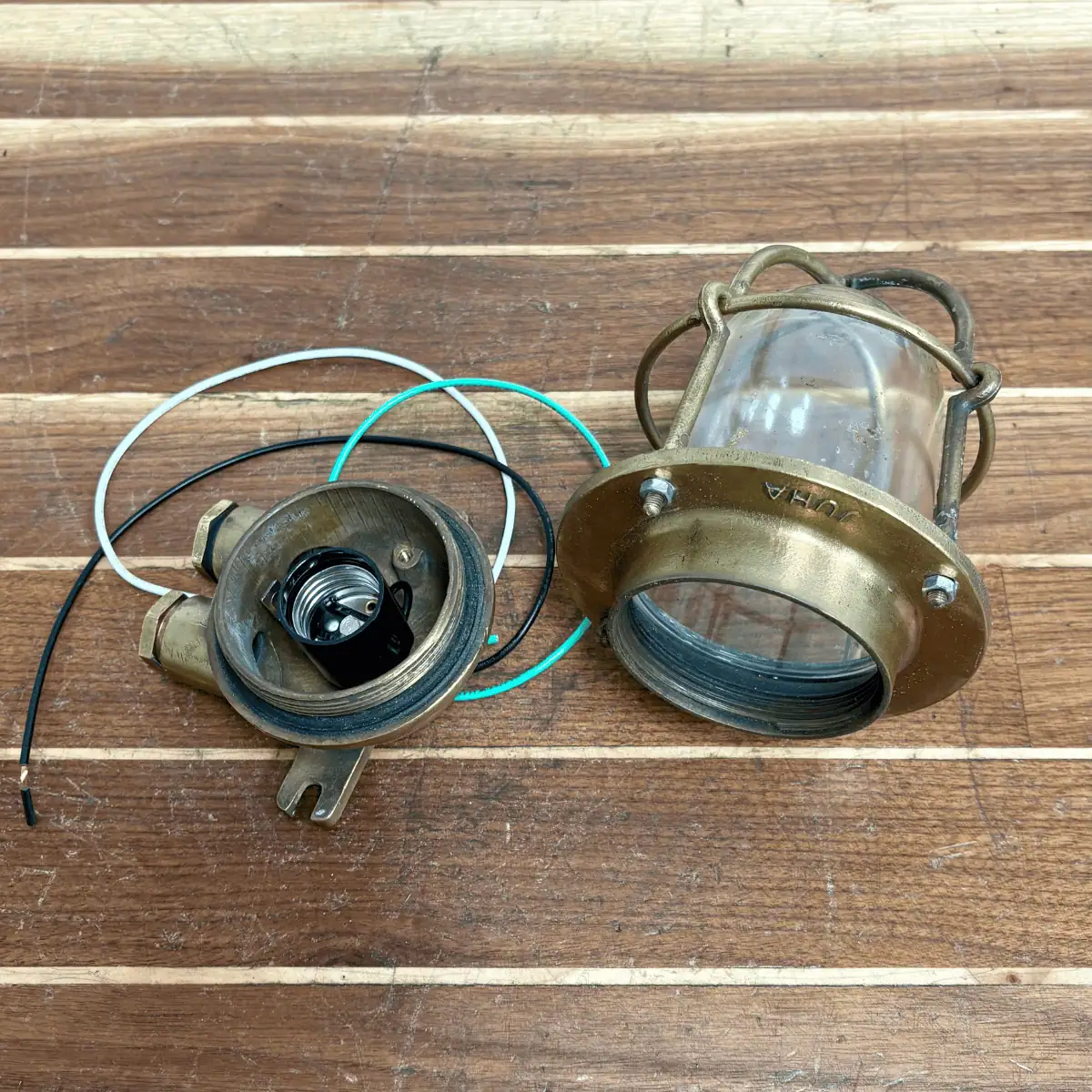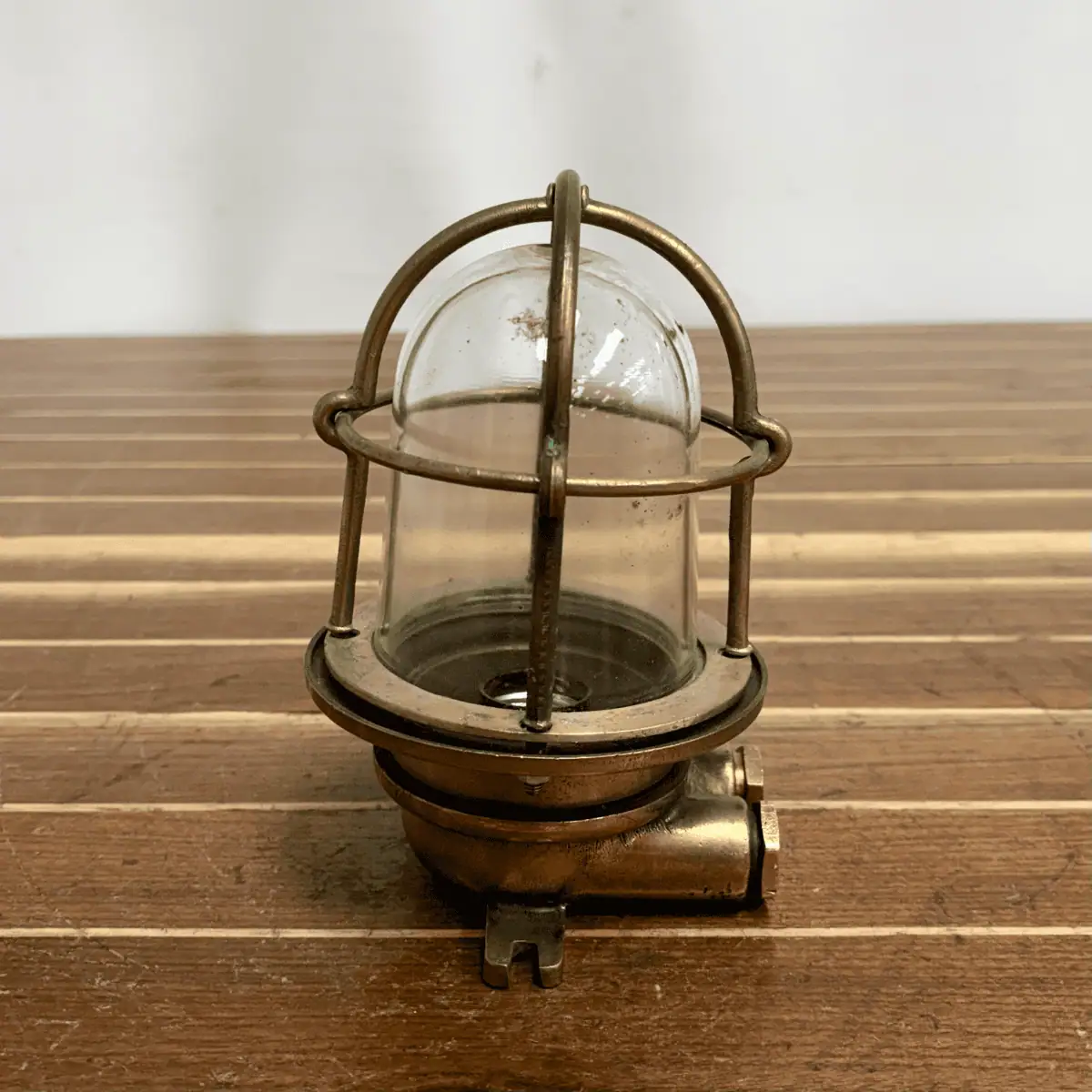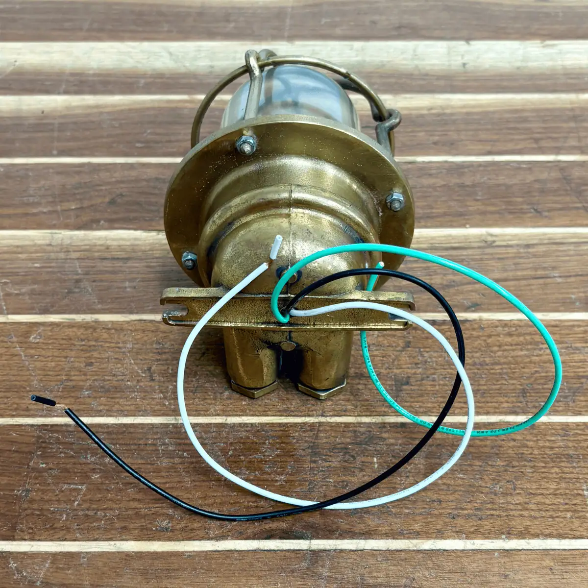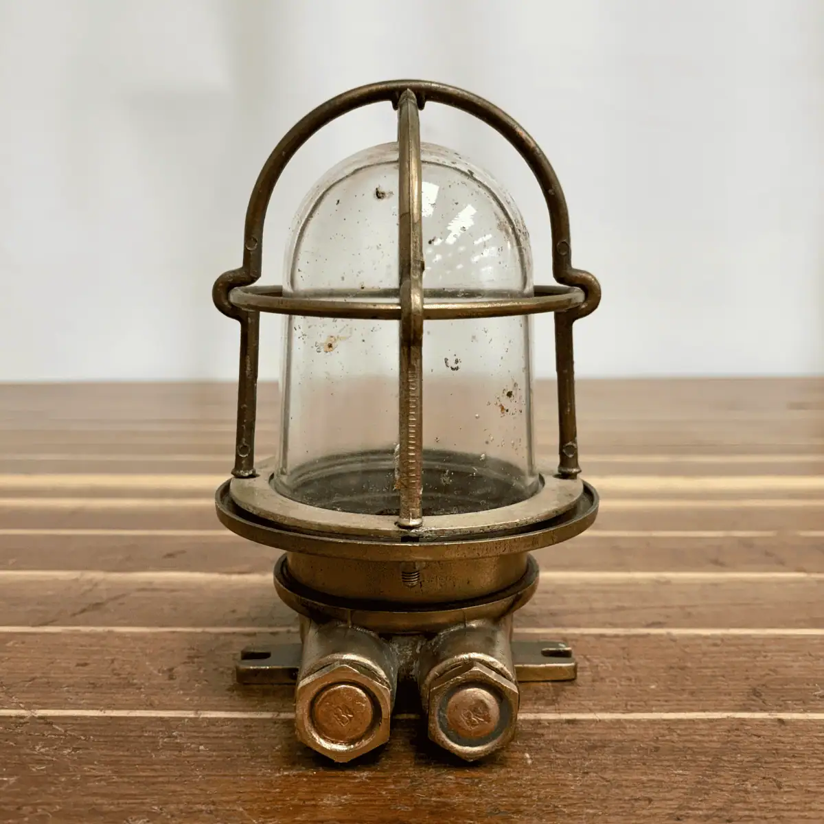 This vintage brass caged marine light comes from a working ship environment. Fixtures like this once delivered dependable illumination in engine rooms, passageways, and service areas aboard vessels.
