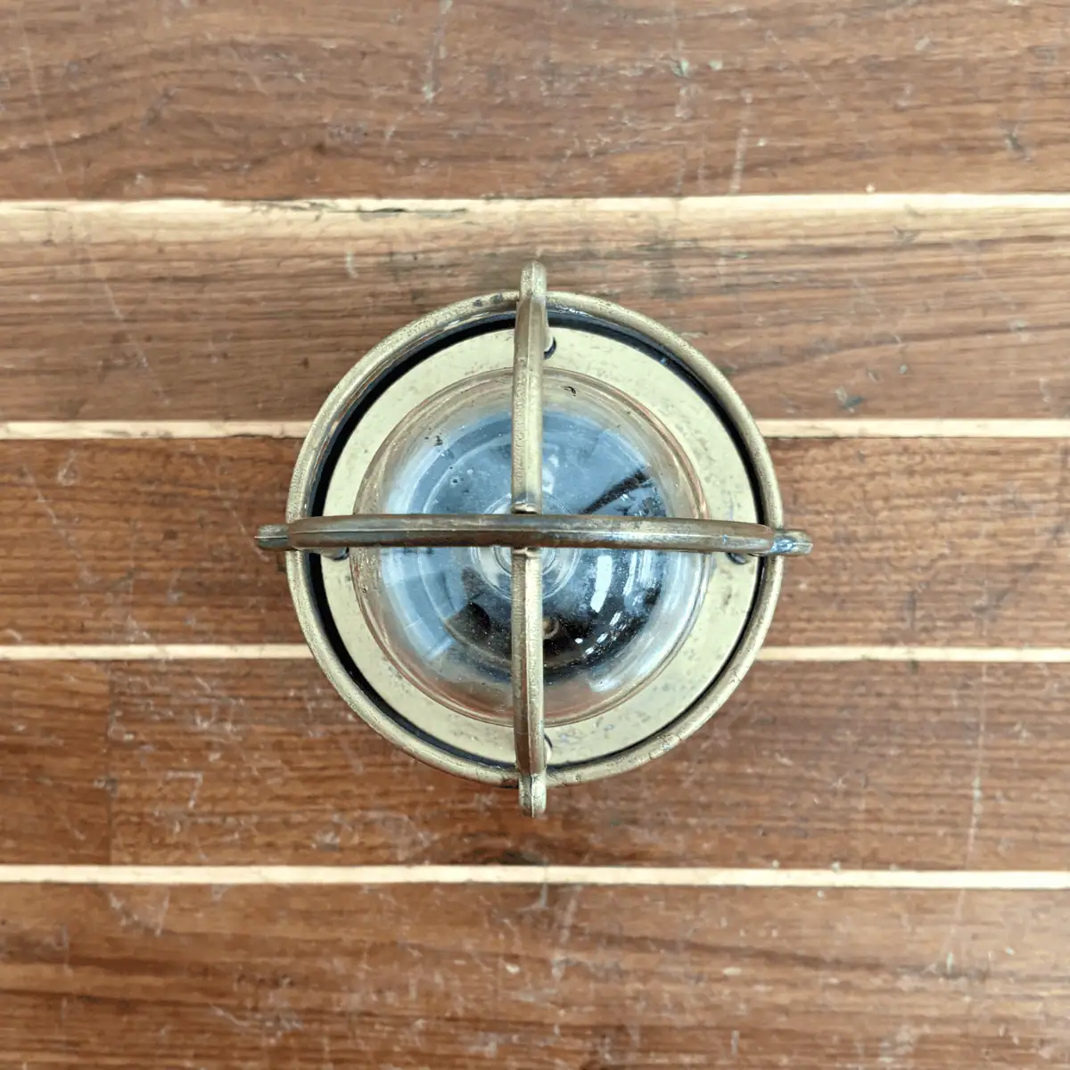 The light features a solid brass body with a protective cage surrounding a clear glass globe. Over time, the brass developed surface wear, patina, and marks from extended marine service. Meanwhile, the glass globe remains intact and shows scattered spotting from age and use.